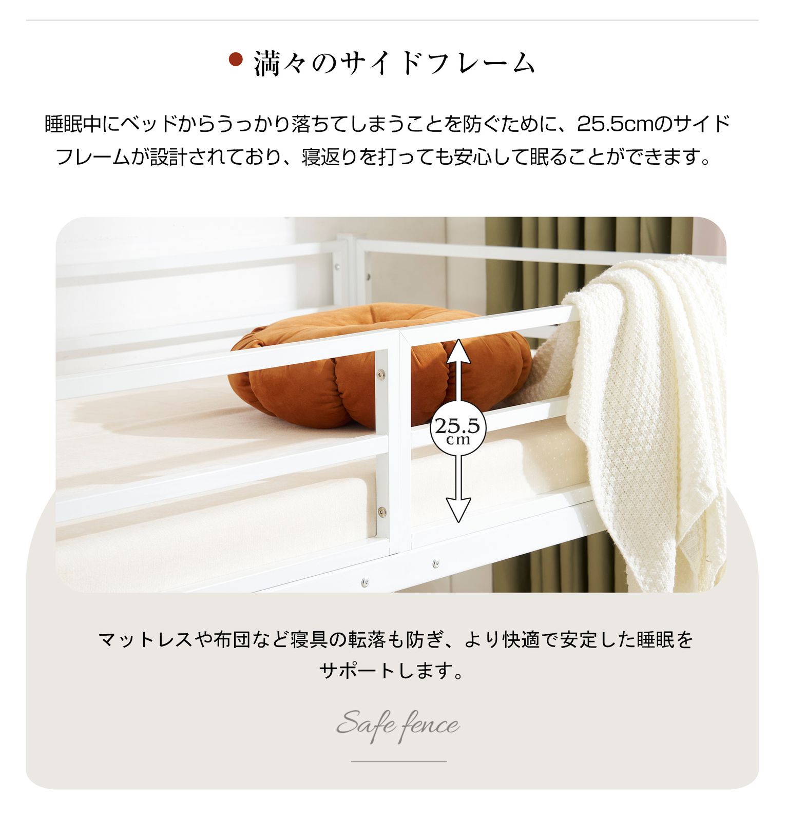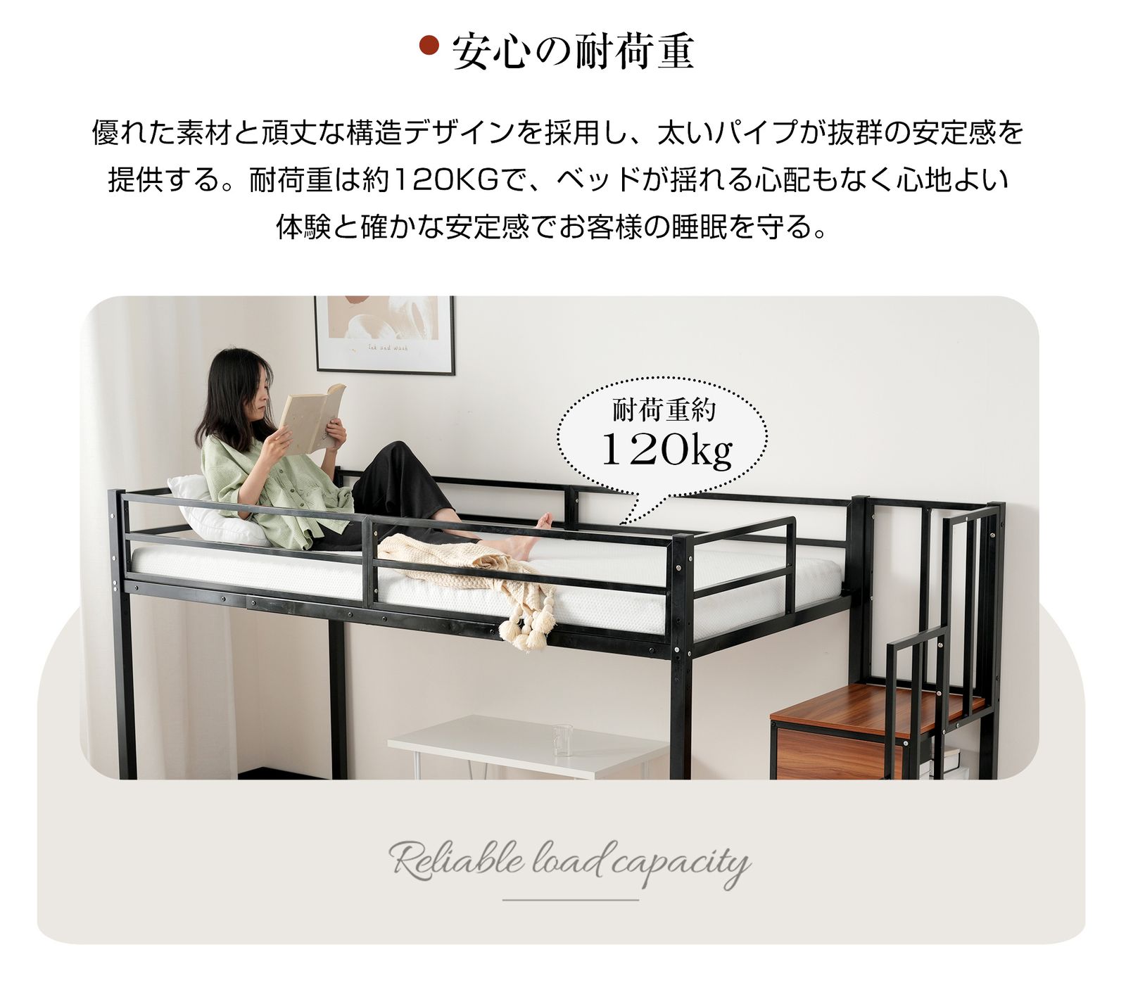 【安心へのこだわり】優れた素材と頑丈な構造デザインを採用し、太いパイプが抜群の安定感を提供する。耐荷重は約120kgで、ベッドが揺れる心配もなく心地よい体験と確かな安定感でお客様の睡眠を守る。ベッドの横揺れを抑えるために、4cm厚のスチールフレームをしっかりと取り付けています。その結果、安定感が格段に向上し、安心してご使用いただけるようになりました。揺れを気にせず、快適な眠りをサポートします。