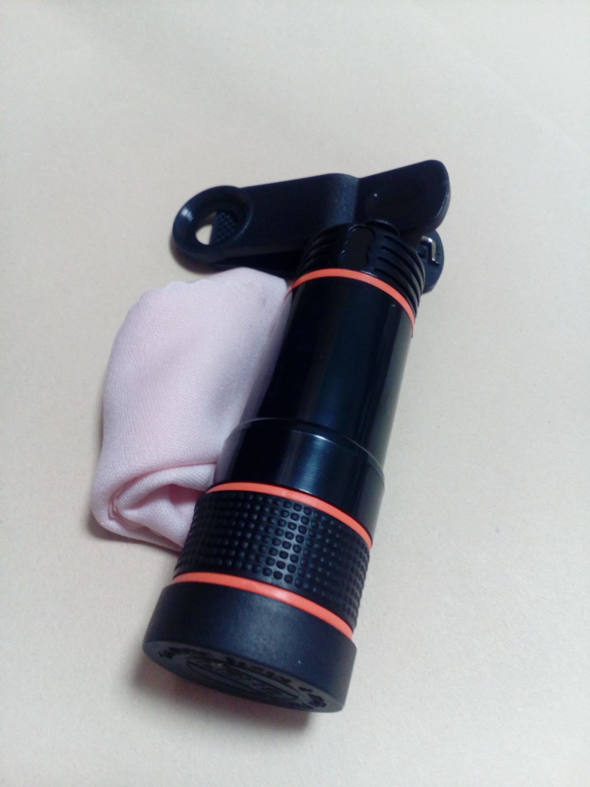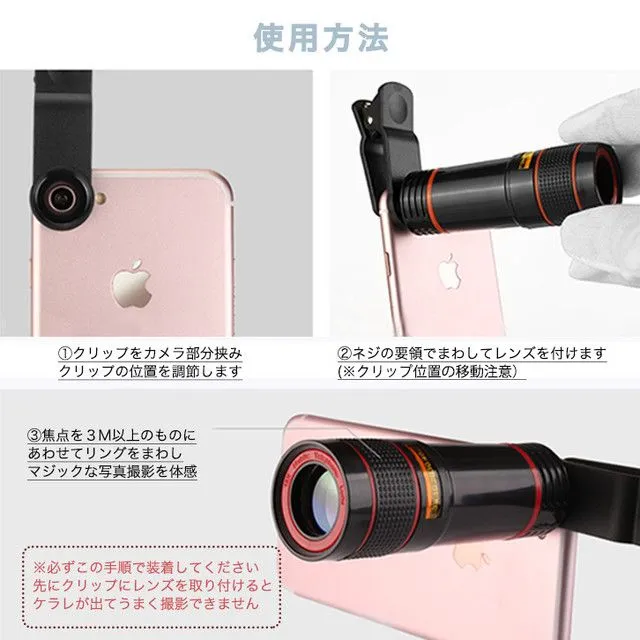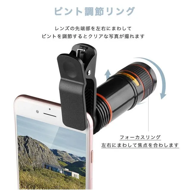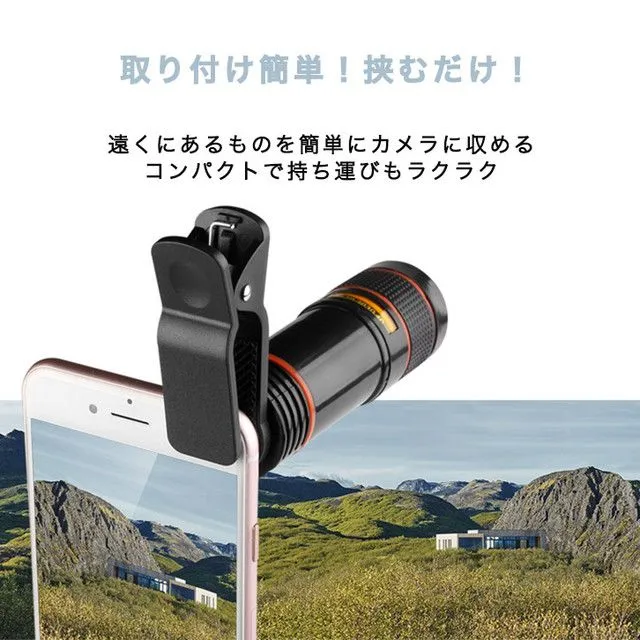この商品はスマートフォン用の望遠レンズです。レンズ部分にワンタッチで取り付けができ、MAX8倍の撮影ができます。