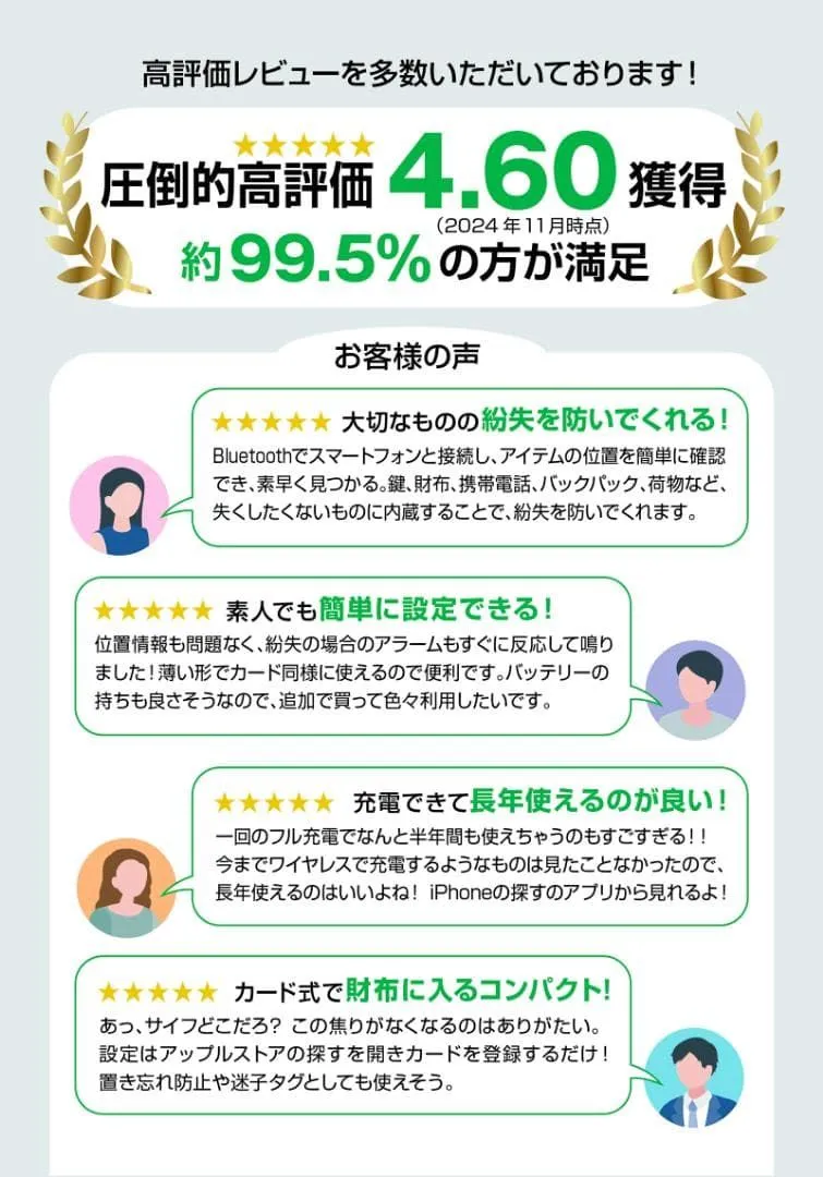 【日本初上陸ワイヤレス充電式 紛失防止タグ】Bluetoothでスマートフォンと接続し、アイテムの位置を簡単に確認でき、素早く見つけることができます。 鍵、財布、携帯電話、バックパック、荷物など、失くしたくないものに内蔵することで、紛失を防ぎます。スマートフォンのワイヤレス充電器に対応しています。1回のフル充電で約6ヶ月間使用いただけます。寿命知らずで、ずっと使えるスマートトラッカーが日本初上陸しました。※ワイヤレス充電器は付属しておりません。
