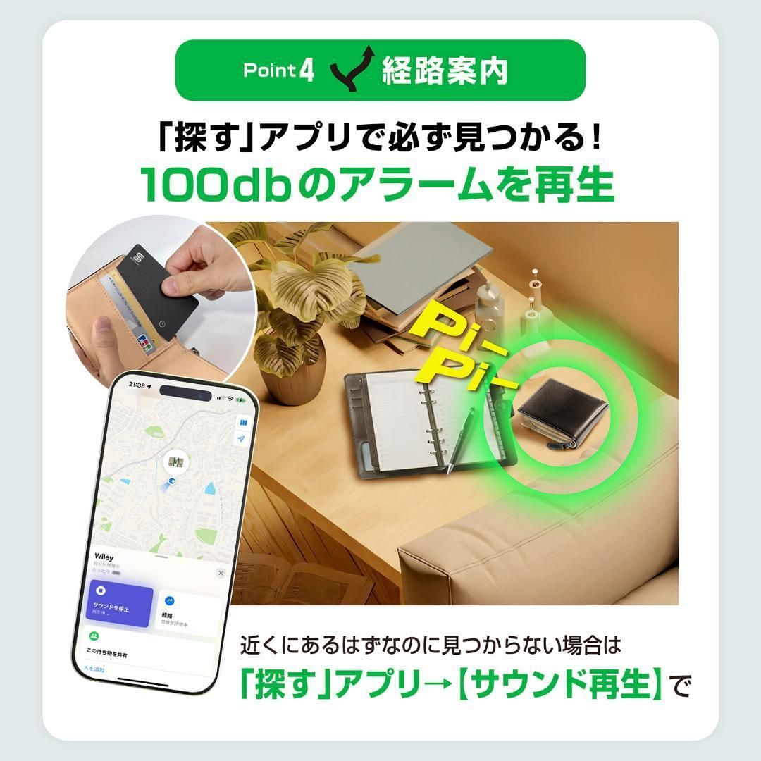 【音で探す & マップで追跡】最大 200フィート/60 m の Bluetooth 範囲 (100 dB の呼び出し音)、超長距離追跡。 「探す」アプリまたは Siri を使用して、トラッカーが範囲内にあるときに着信音を鳴らすことができます。 また、トラッカーが範囲外にある場合でも、Find My ネットワーク上の何億もの Apple デバイスでトラッカーを見つけることができます。