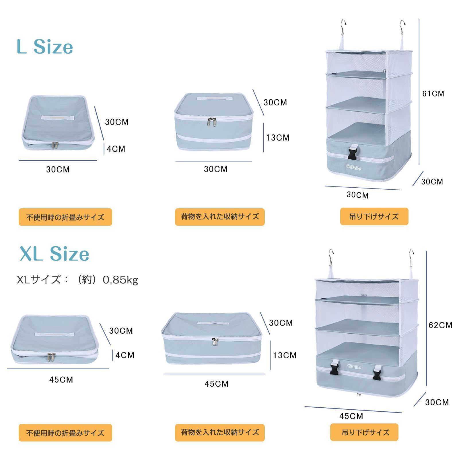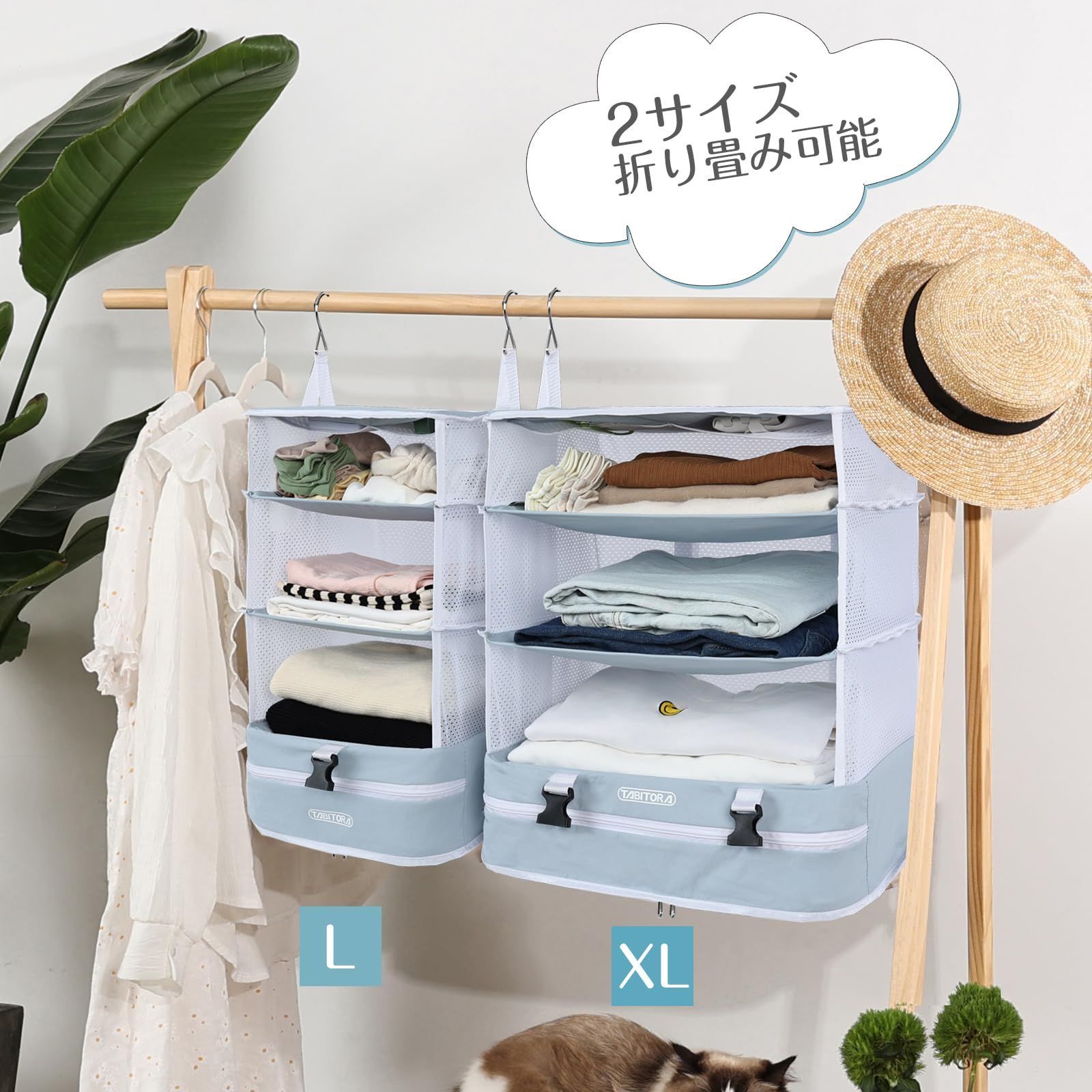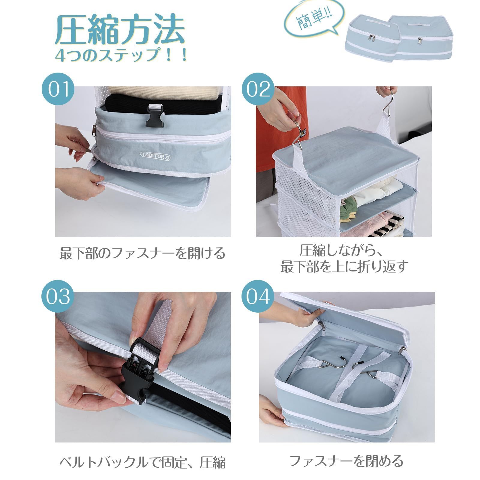 【旅行や出張】:吊り下げ収納バッグはコンパクトに折りたためるので、スーツケースに入れて持ち運びが簡単です。移動先ではクローゼットやドアに吊るして、ホテルの部屋を整理整頓できます。