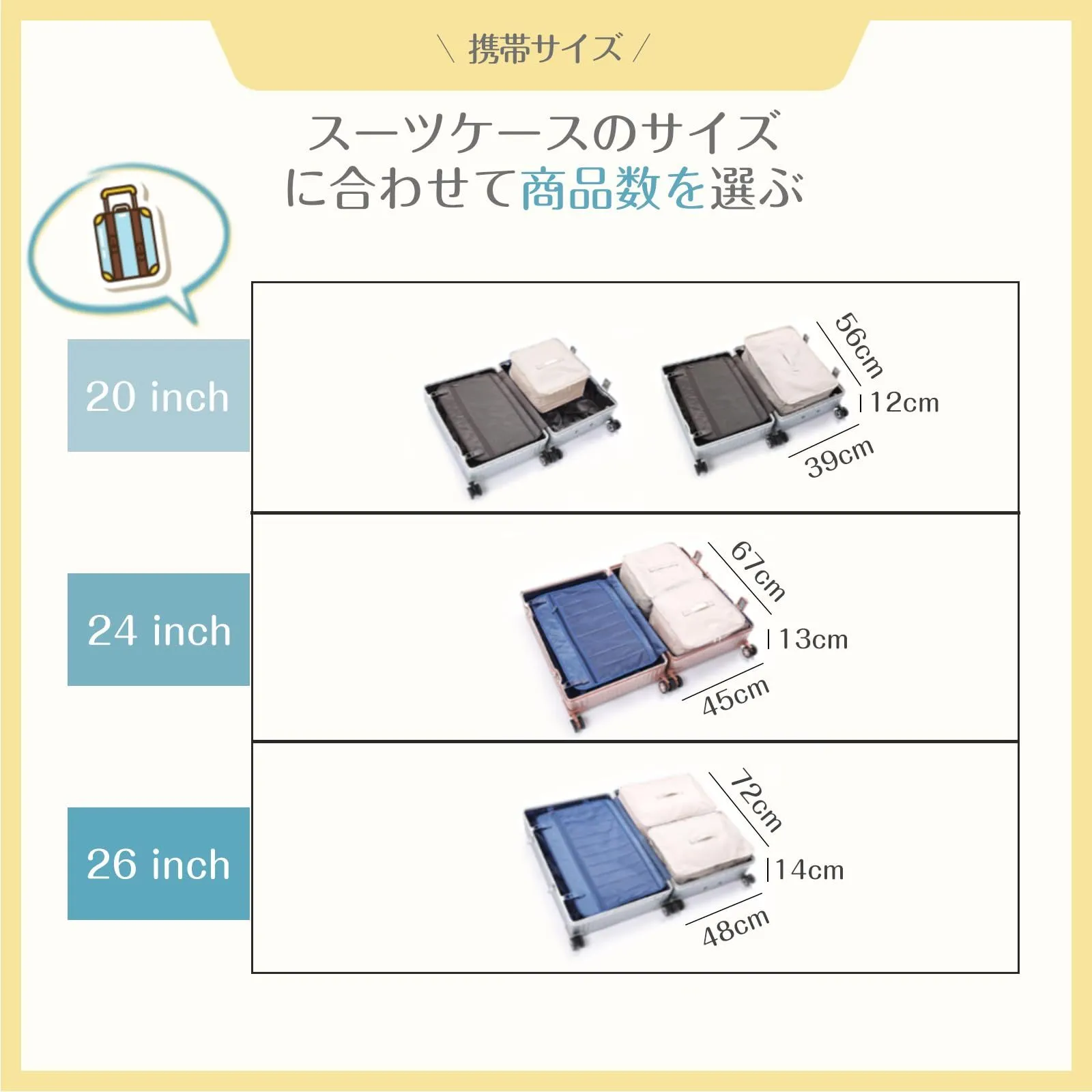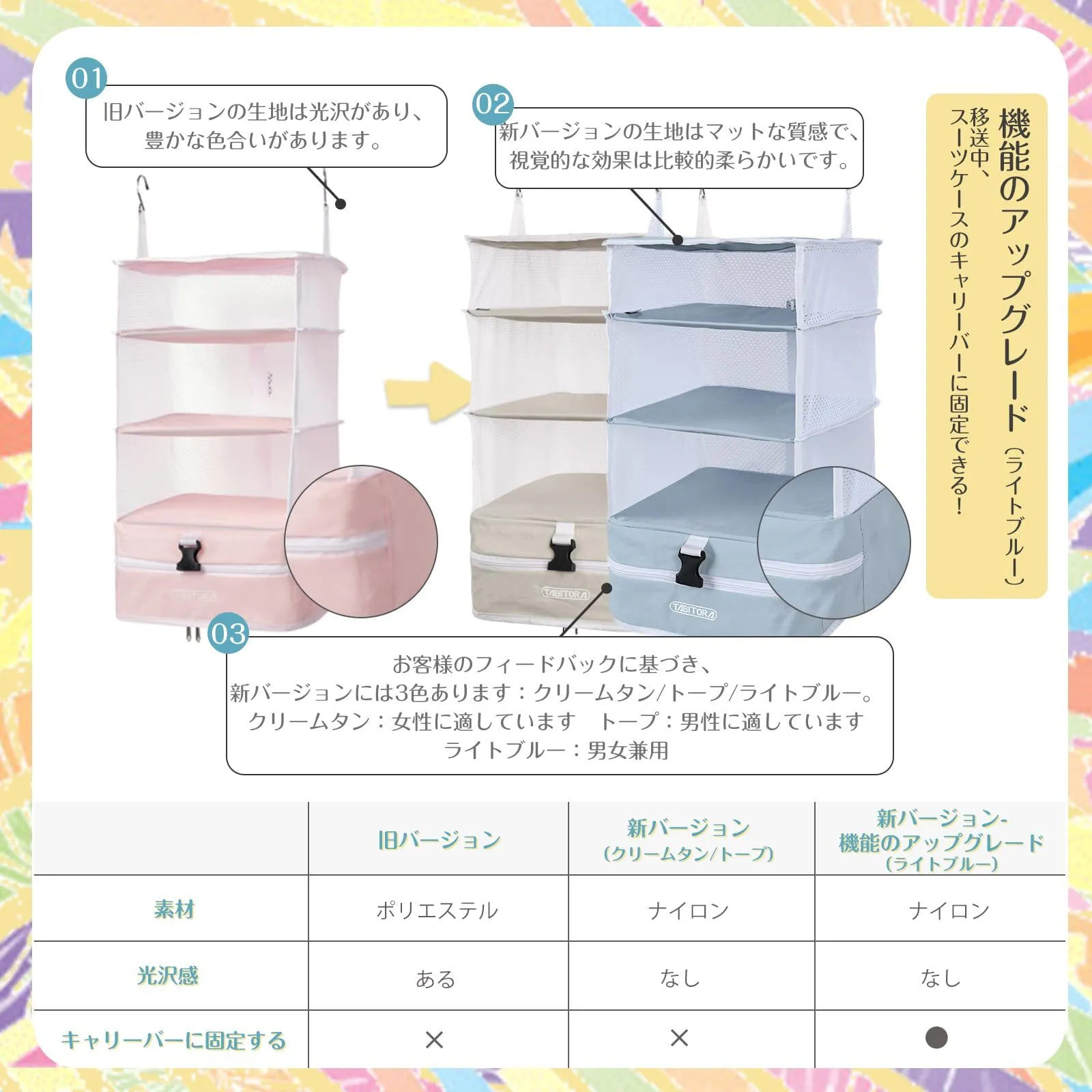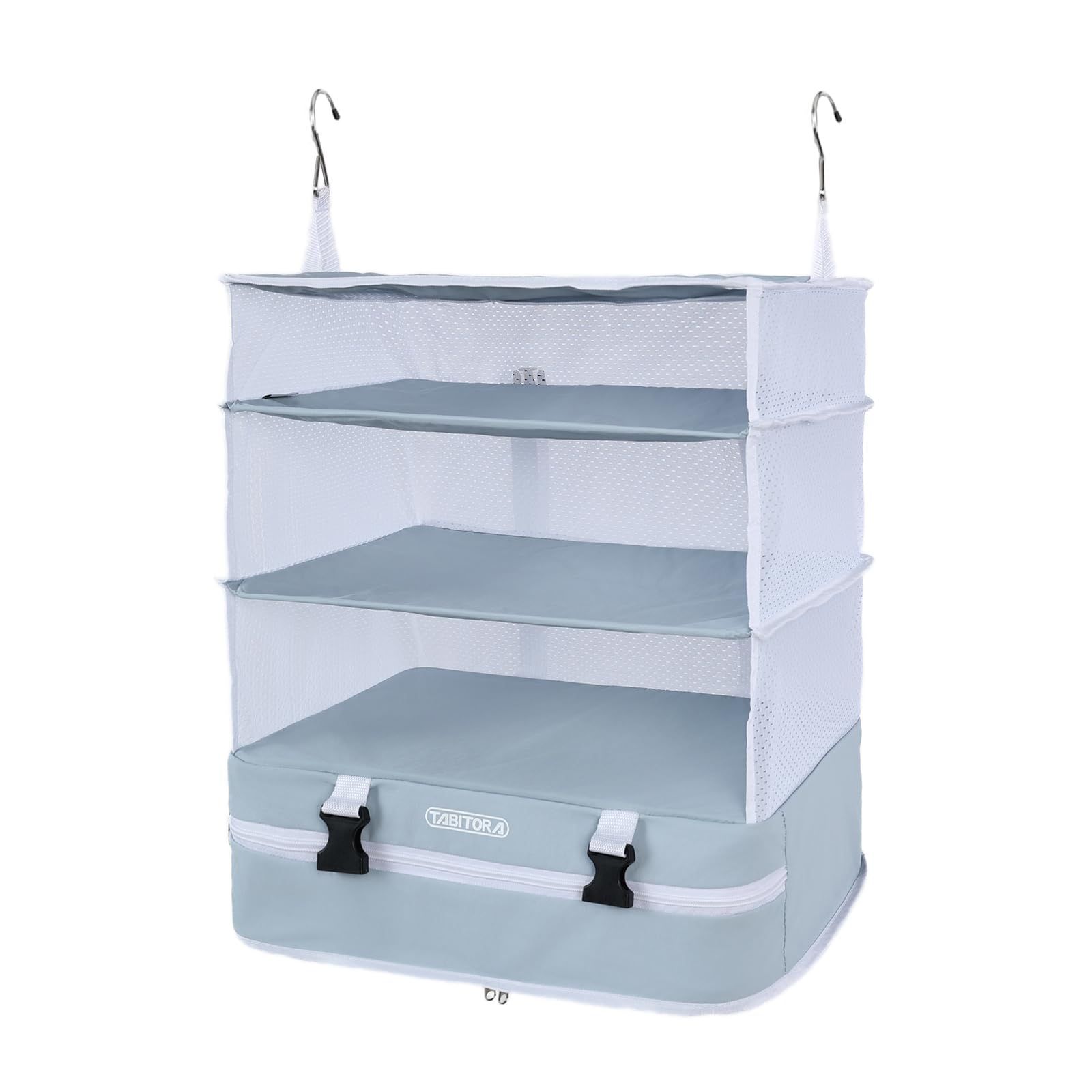 【旅行や出張】:吊り下げ収納バッグはコンパクトに折りたためるので、スーツケースに入れて持ち運びが簡単です。移動先ではクローゼットやドアに吊るして、ホテルの部屋を整理整頓できます。