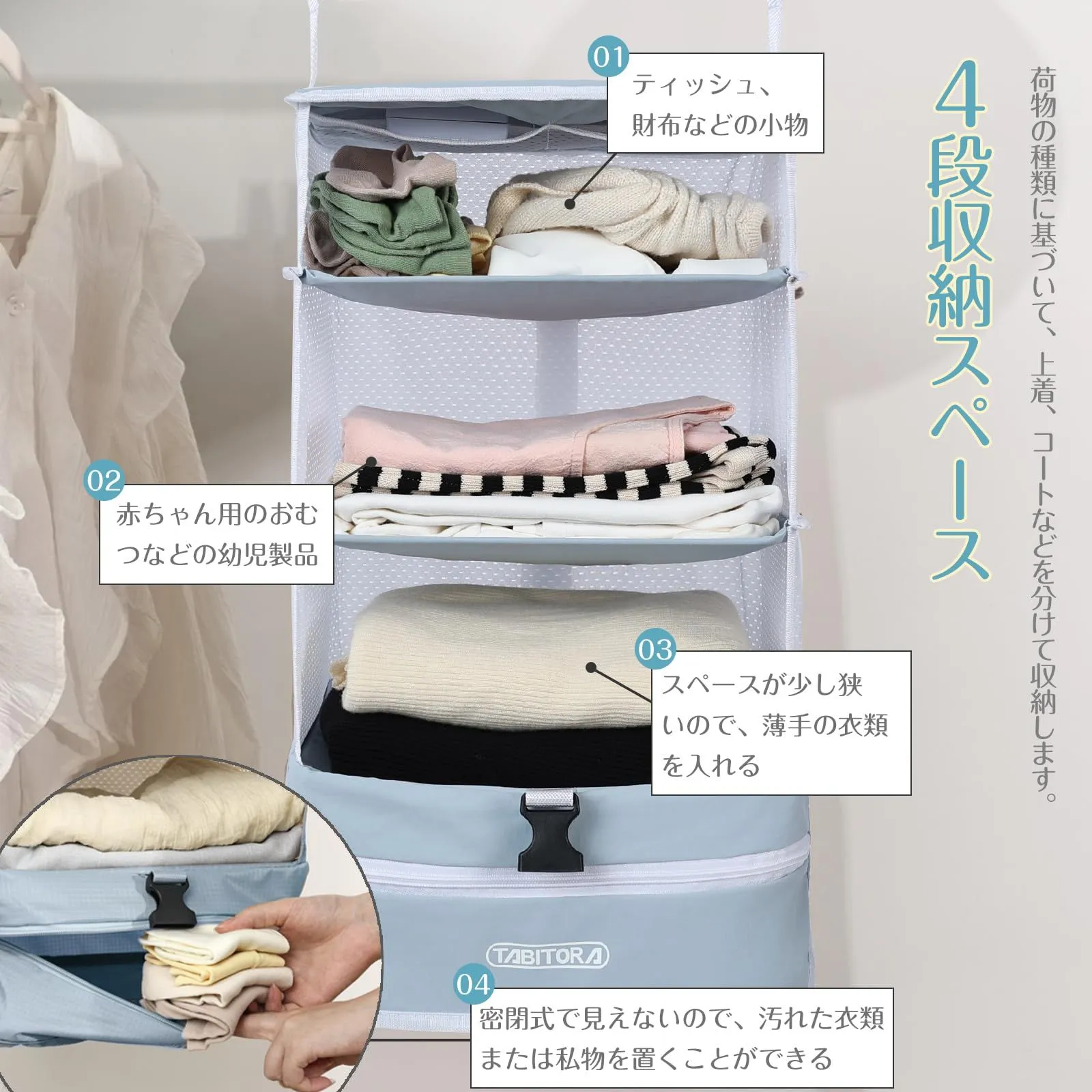 【スペースの有効活用】:4段吊り下げ収納ボックスは壁面やクローゼットの空間を有効活用できるため、収納スペースを最大限に活かすことができます。部屋の中がスッキリと片付けられるため、見た目もすっきりとした印象を与えます。