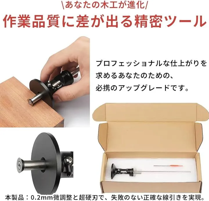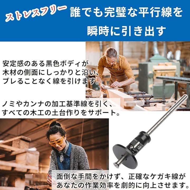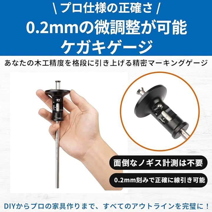 このケガキゲージは、アルミ製の高耐久ボディで精密な作業に最適で、直線・直角・角度を簡単にマーキングでき、木工・金属加工・スコヤ測定に活躍します
