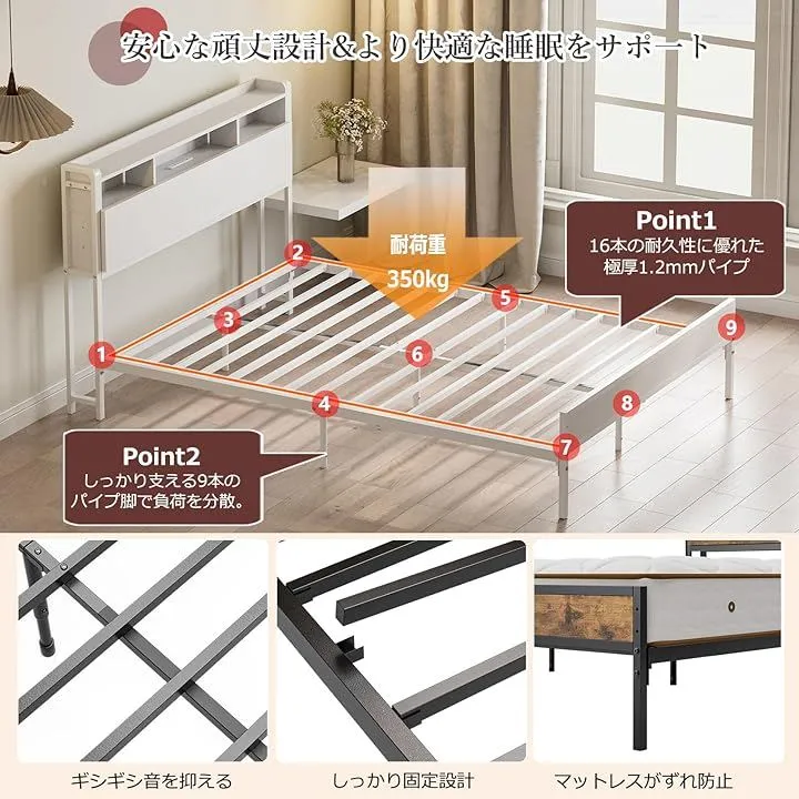 「350kgの耐荷重。 耐久性と驚異の安定感」ベッドフレームは16本の高強度スチール製フレームと9本の太く頑丈なサポート脚を組み合わせた構造に加え、接合部の金具一つひとつまで強化を追求。