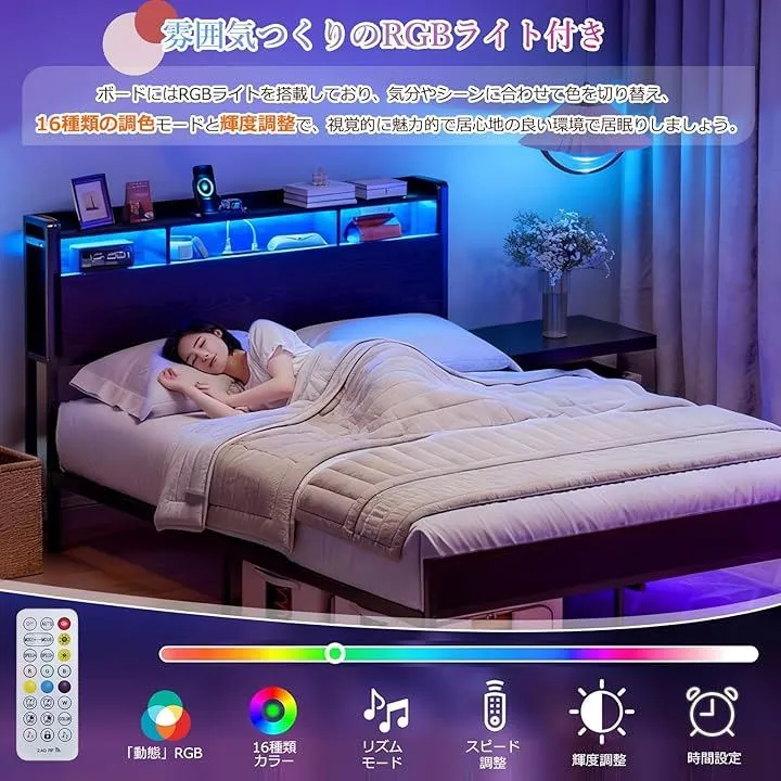 「居眠り雰囲気つくりのRGBライト付きヘッドボード」ヘッドボードに内蔵されたマルチカラーライトは、お好みの色や明るさ、点滅速度を自由に調整可能。