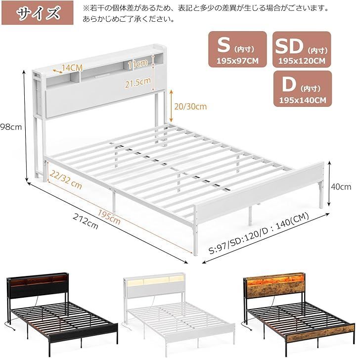 「商品仕様」*商品サイズ(cm):幅140x奥行212x高さ98cm *商品重量:約32.5kg *梱包サイズ:143.5x34x17.5CM *梱包重量:34.9kg *材質:本体/スチール(粉体塗装)棚板/MDF *対応マットレスサイズ:ダブルサイズ(幅140x長さ195cm) *耐荷重:本体/約350kg ヘッド部棚/約20kg *カラー:ブラック/ホワイト/ビンテージ 組立品/完成品:組立品(2人で組立て時間約45分)。