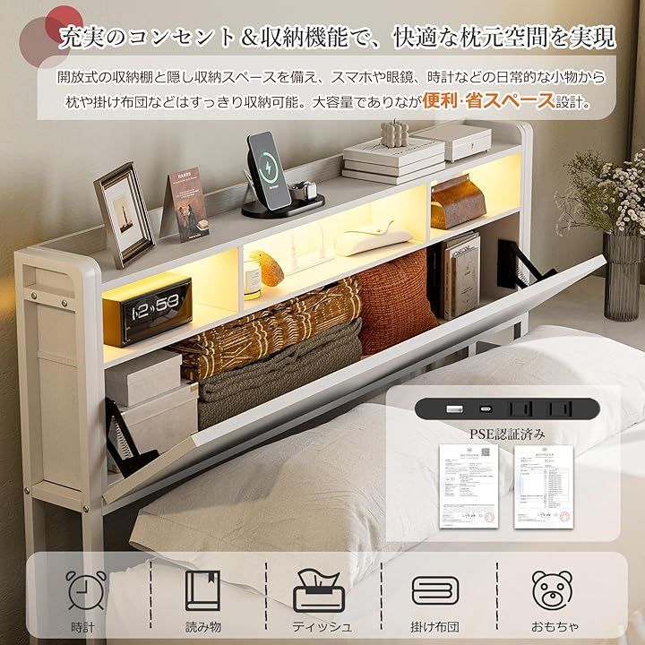 「充実のコンセント&収納機能で、快適な枕元空間を実現」開放式の収納棚と大容量の隠し収納スペースを備え、スマホや眼鏡、時計などの日常的な小物はすぐ手に取れる場所に。