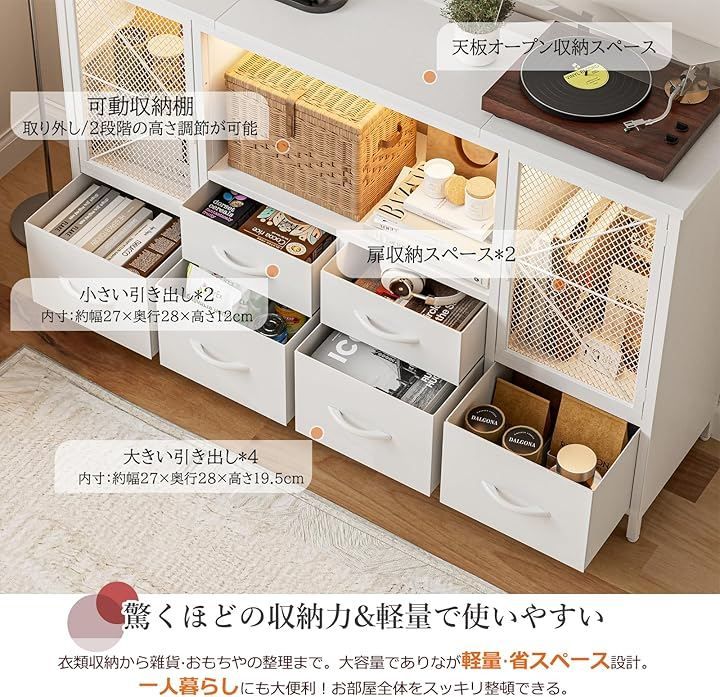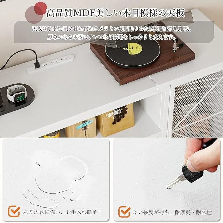 テレビやコーヒーメーカーなどの小型家電を収納しながら、手元で充電できる便利さが特徴です。