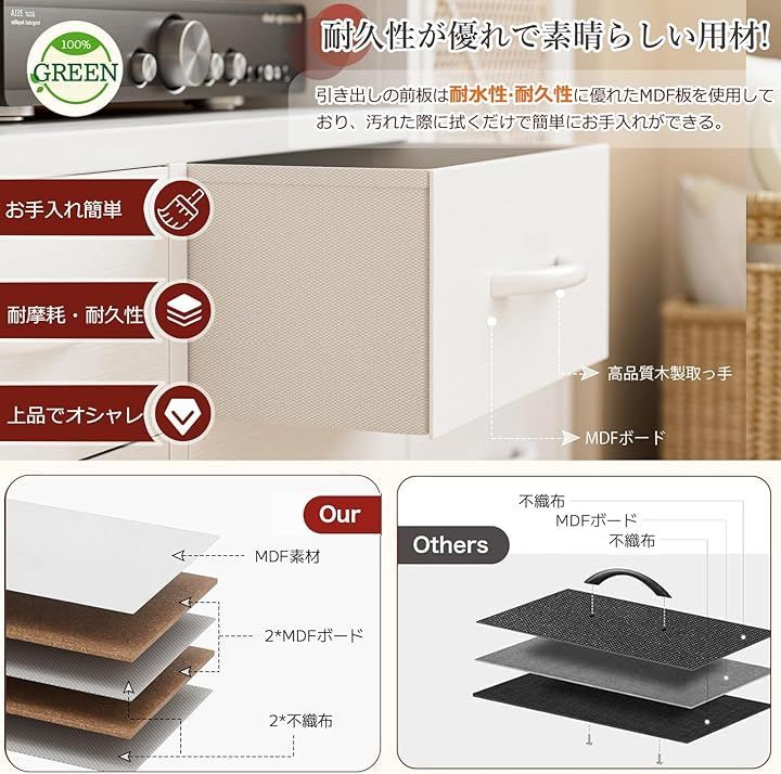 耐荷重:天板[30kg]・可動棚[10kg]・ 引き出し[15kg]。