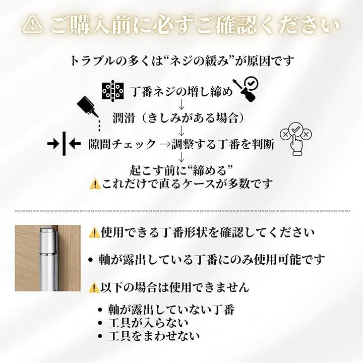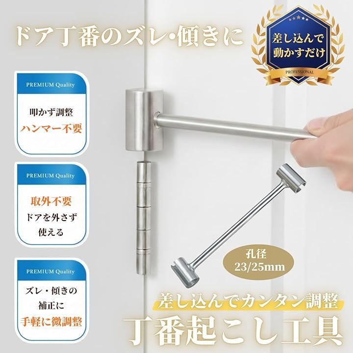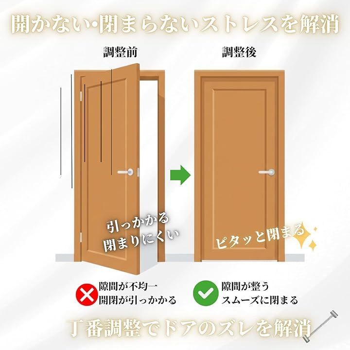 ドアの歪みを外さず補正 ドアを取り外すことなく丁番の曲がりを調整。