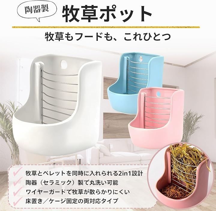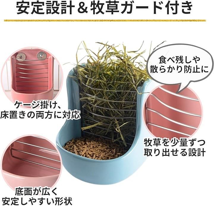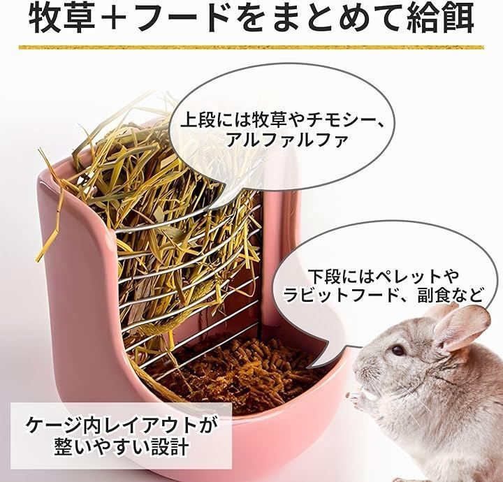 上部には牧草・チモシー・アルファルファなどの主食をセットし、下部にはペレット・ラビットフード・副食を入れられる構造で、これ一台で給餌スペースをまとめて管理できます。
