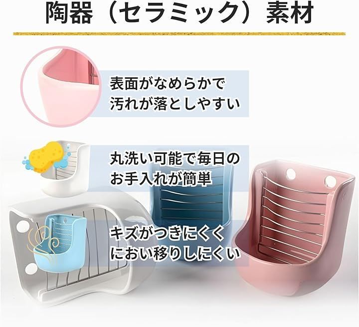「陶器(セラミック)素材で丸洗いしやすく衛生管理が簡単」陶器(セラミック)素材を採用することで表面がなめらかでフード汚れや牧草くずが付着しにくく、水洗い・丸洗いがしやすいため、毎日の清掃やお手入れがスムーズに行えます。