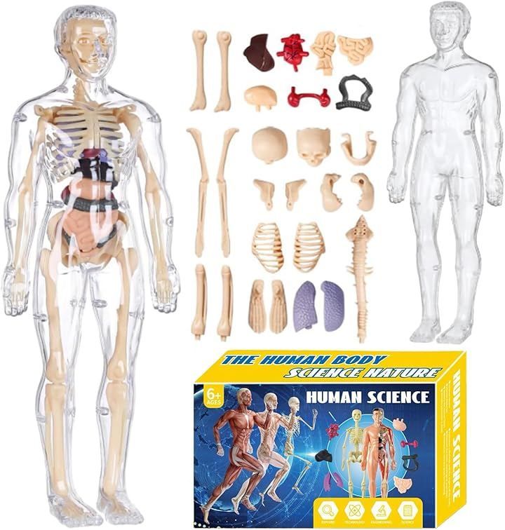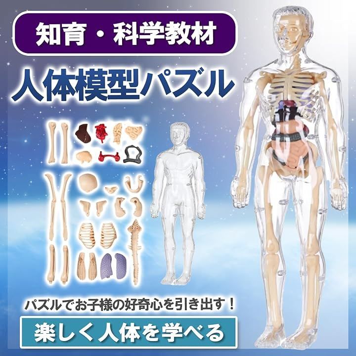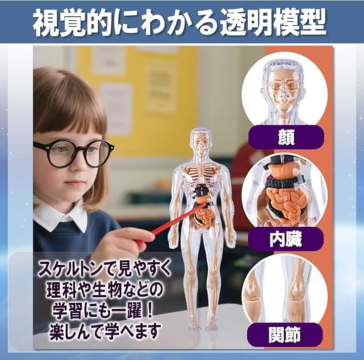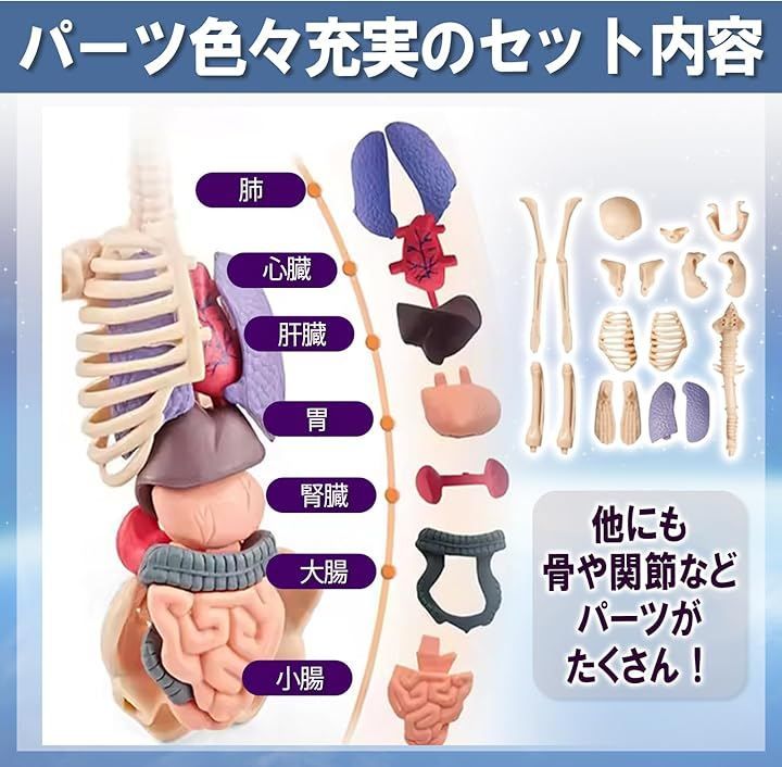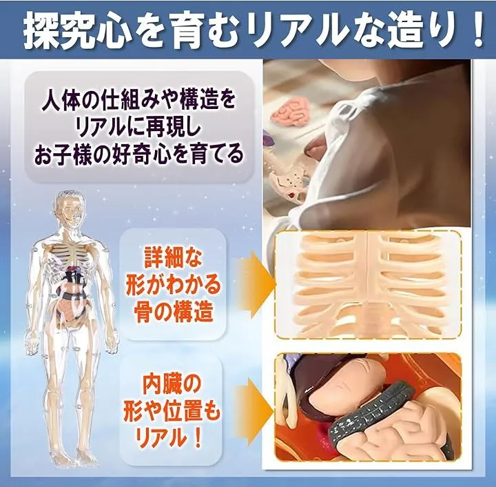 おもちゃ感覚で扱えるのに、骨格模型としての再現性も高く、内臓取り外し可能な構造が理解を深めます。
