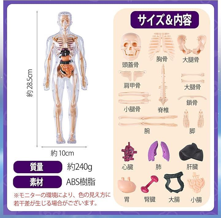 素材はABS樹脂を使用し、骨・臓器は色分けされた仕様です。