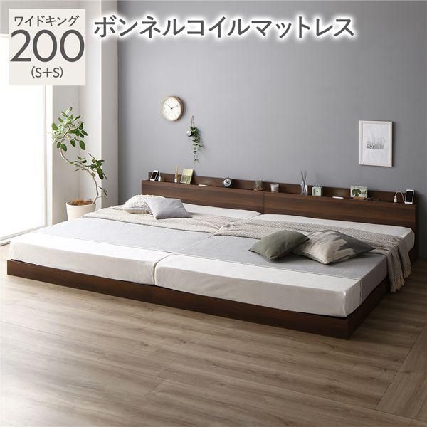 商品名:ベッド ワイドキング 200 S+S ボンネルコイルマットレス付 ブラウン 宮付 連結ベッド すのこベッド