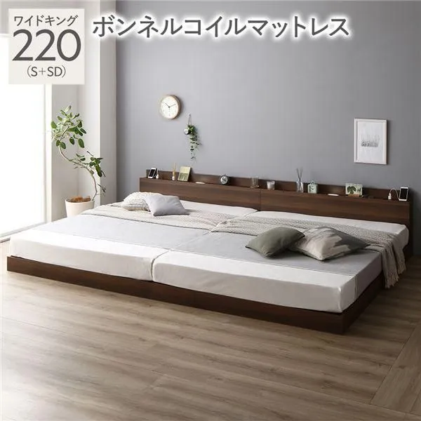 商品名:ベッド ワイドキング 220 S+SD ボンネルコイルマットレス付 ブラウン 宮付 連結ベッド すのこベッド
