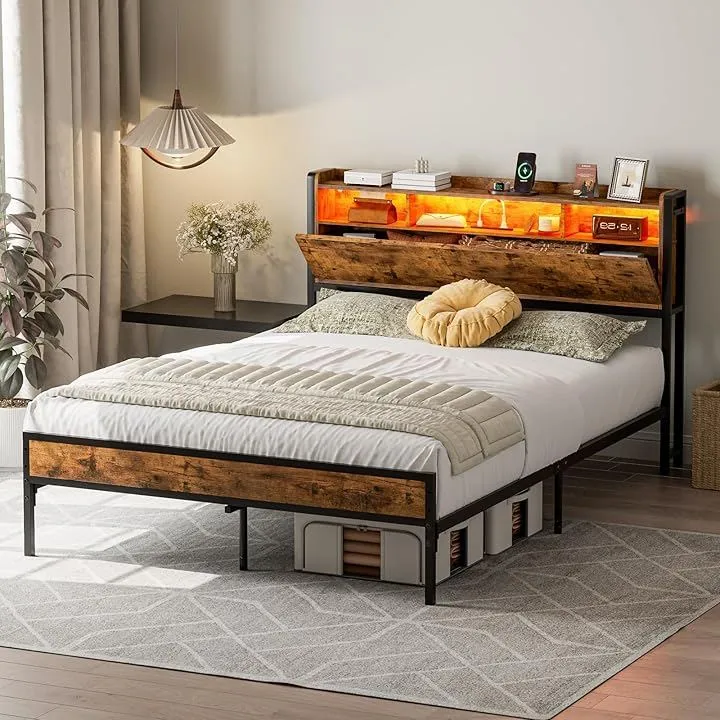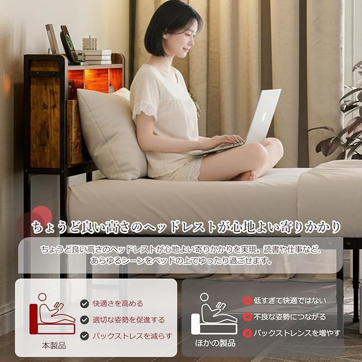 「充実のコンセント&収納機能で、快適な枕元空間を実現」開放式の収納棚と大容量の隠し収納スペースを備え、スマホや眼鏡、時計などの日常的な小物はすぐ手に取れる場所に。