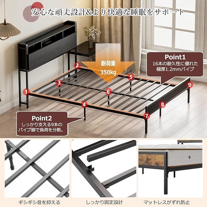 「350kgの耐荷重。 耐久性と驚異の安定感」ベッドフレームは16本の高強度スチール製フレームと9本の太く頑丈なサポート脚を組み合わせた構造に加え、接合部の金具一つひとつまで強化を追求。