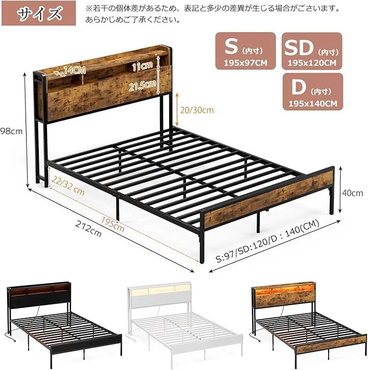 「商品仕様」*商品サイズ(cm):幅140x奥行212x高さ98cm *商品重量:約32kg *梱包サイズ:143x34x17.3CM *梱包重量:34.2kg *材質:本体/スチール(粉体塗装)棚板/MDF *対応マットレスサイズ:シダブルサイズ(幅140x長さ195cm) *耐荷重:本体/約350kg ヘッド部棚/約20kg *カラー:ブラック/ビンテージ/ホワイト 組立品/完成品:組立品(2人で組立て時間約45分)。