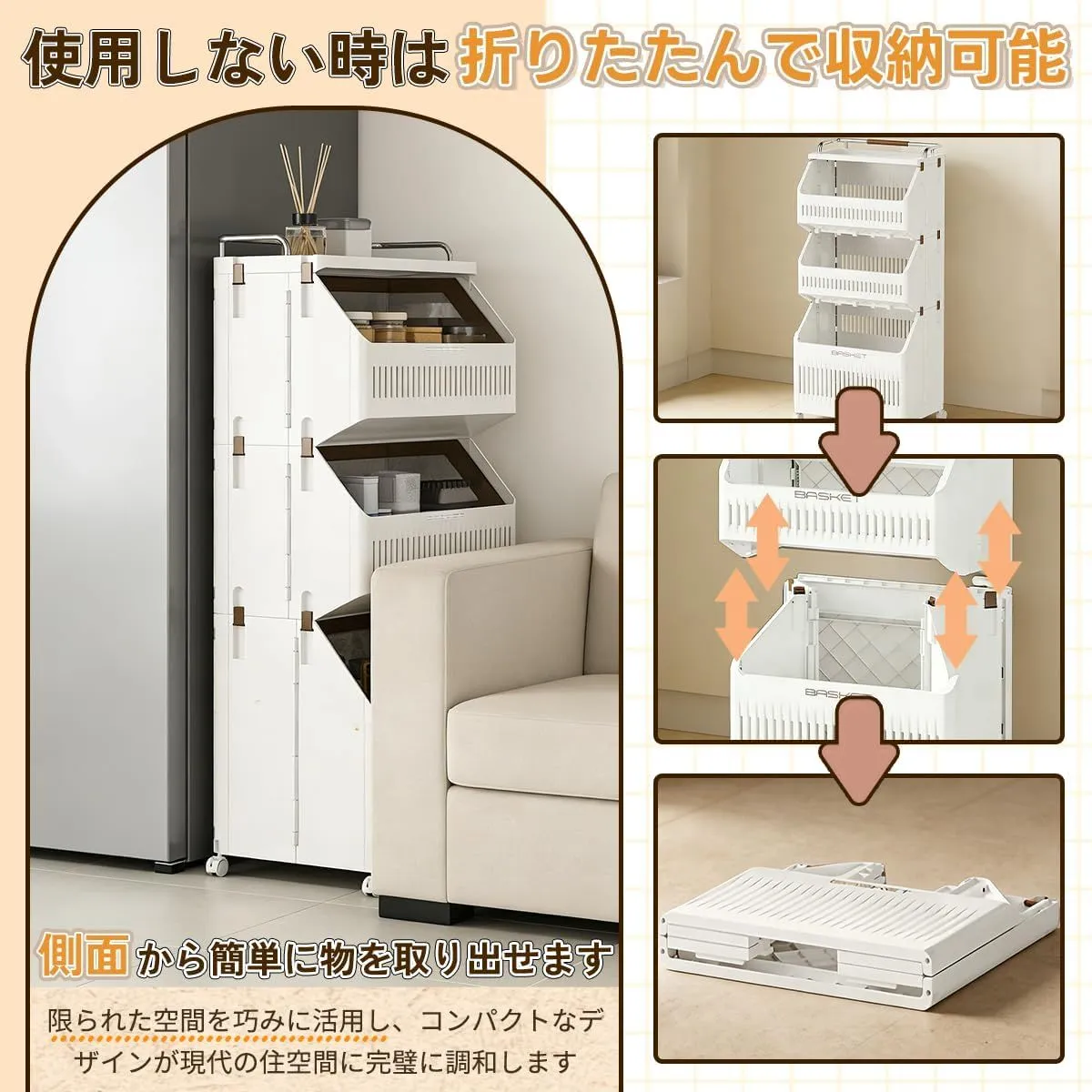 ランドリーワゴン 4段 折りたたみ式 ランドリーバスケット キャスター付き 幅40cm スリム 隙間収納 洗濯かご 収納ラック 通気設計 移動式 脱衣所・浴室・キッチン対応 組立簡単(明るい白,40x30x97.5cm)