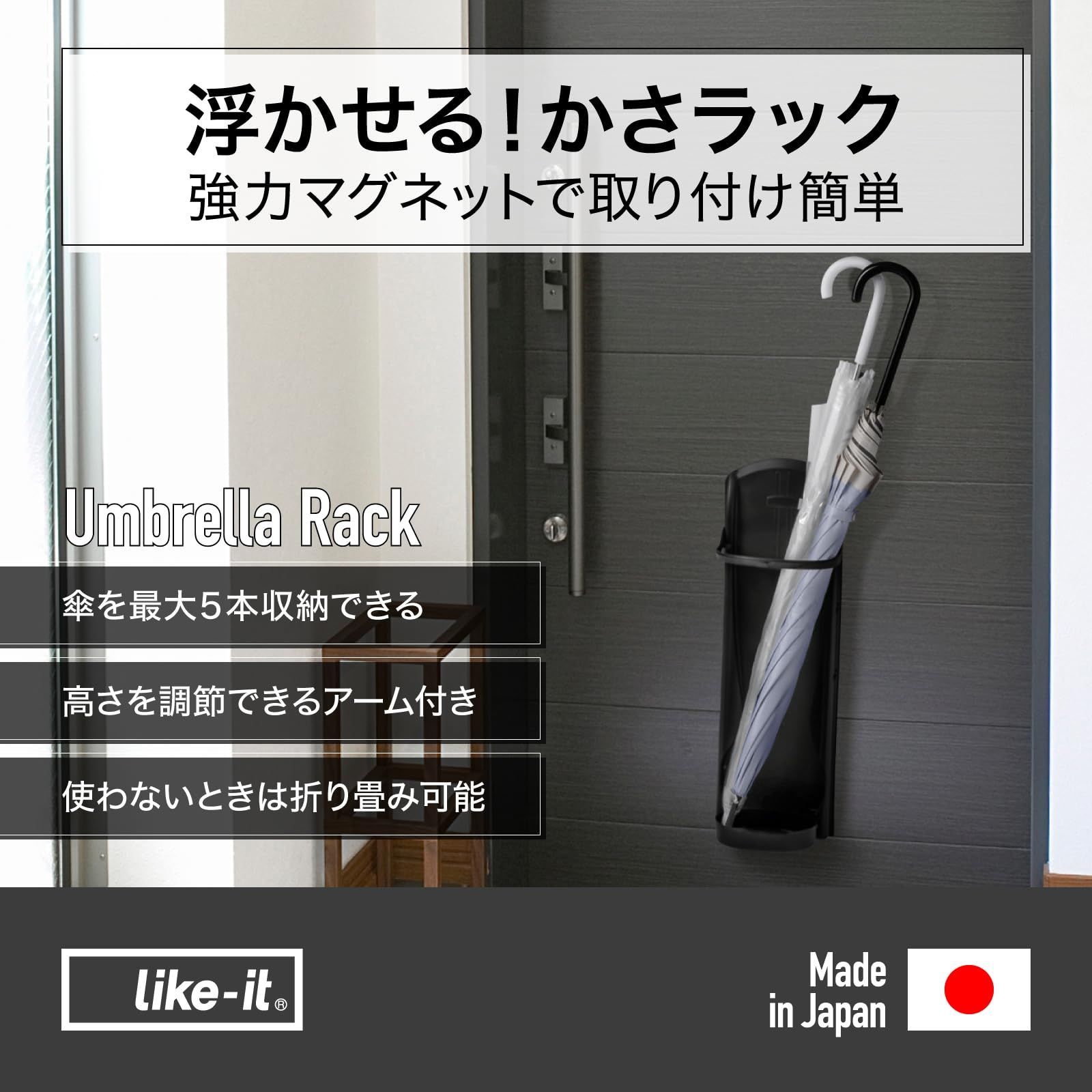 ライクイット (like-it) 玄関 傘収納 強力マグネット 折りたたみ可 コンパクト 壁設置 約幅17.5x奥12.2x高54cm 日本製 かさラック ブラック