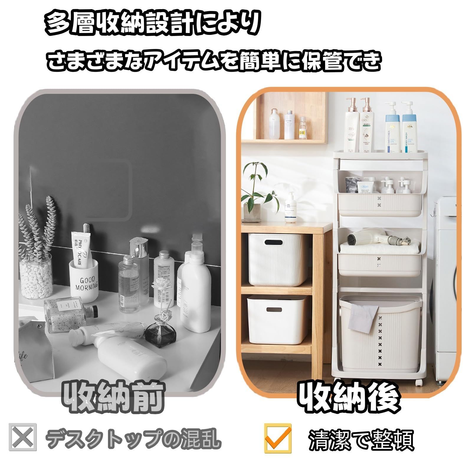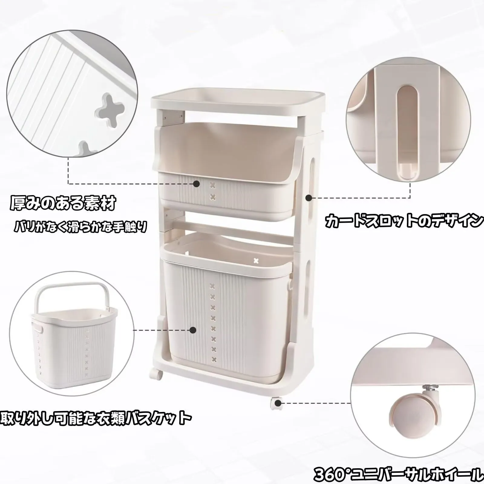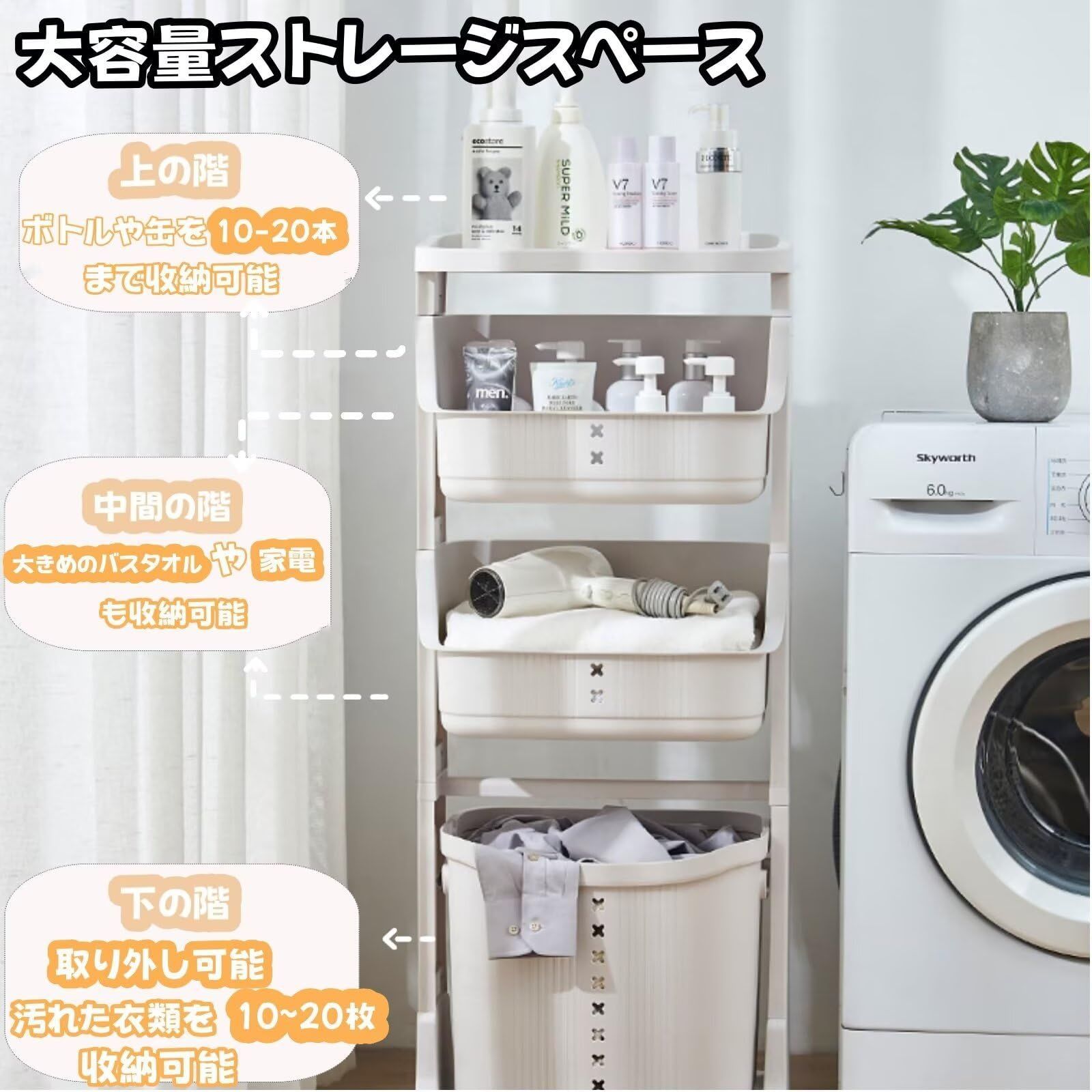 特徴 多層設計、キャスター付き、取り外し可能なランドリーバスケット、隙間収納