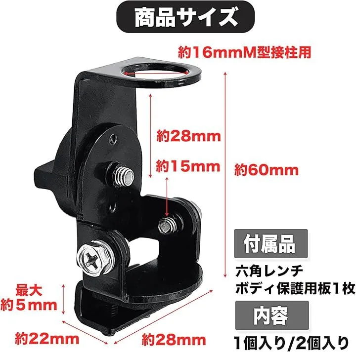 「商品内容」1個または2個 付属品:挟み込みプレート1枚、六角レンチ1個 サイズ:全長約60mm、台座部分:約28mmx22mm、挟み込み部分:約5mm まで