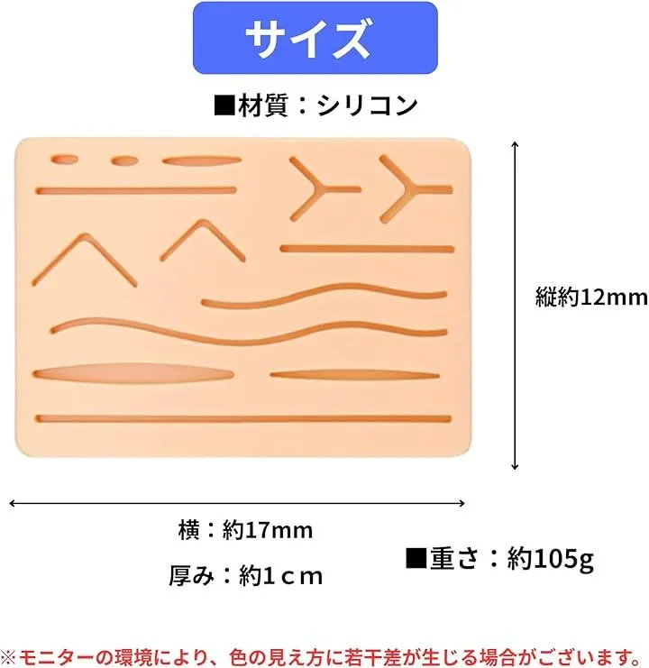 人工皮膚の深さや形状が多様で、現場レベルの縫合感をシリコンで再現。