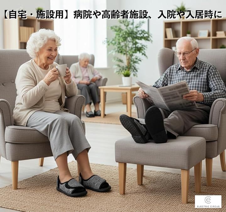 「簡単着脱フルオープン」脱着しやすい大きな面ファスナーでフィット感を調整・履きやすく蒸れにくいメッシュ素材・足の負担を軽減してつまずきや転倒を防ぎ、歩行しやすい・さっと履けて脱ぎやすい、長時間歩いても疲れにくい軽量設計で持ち運びにも便利・幅広い年齢層でお年寄りにも安心して履けるデザイン