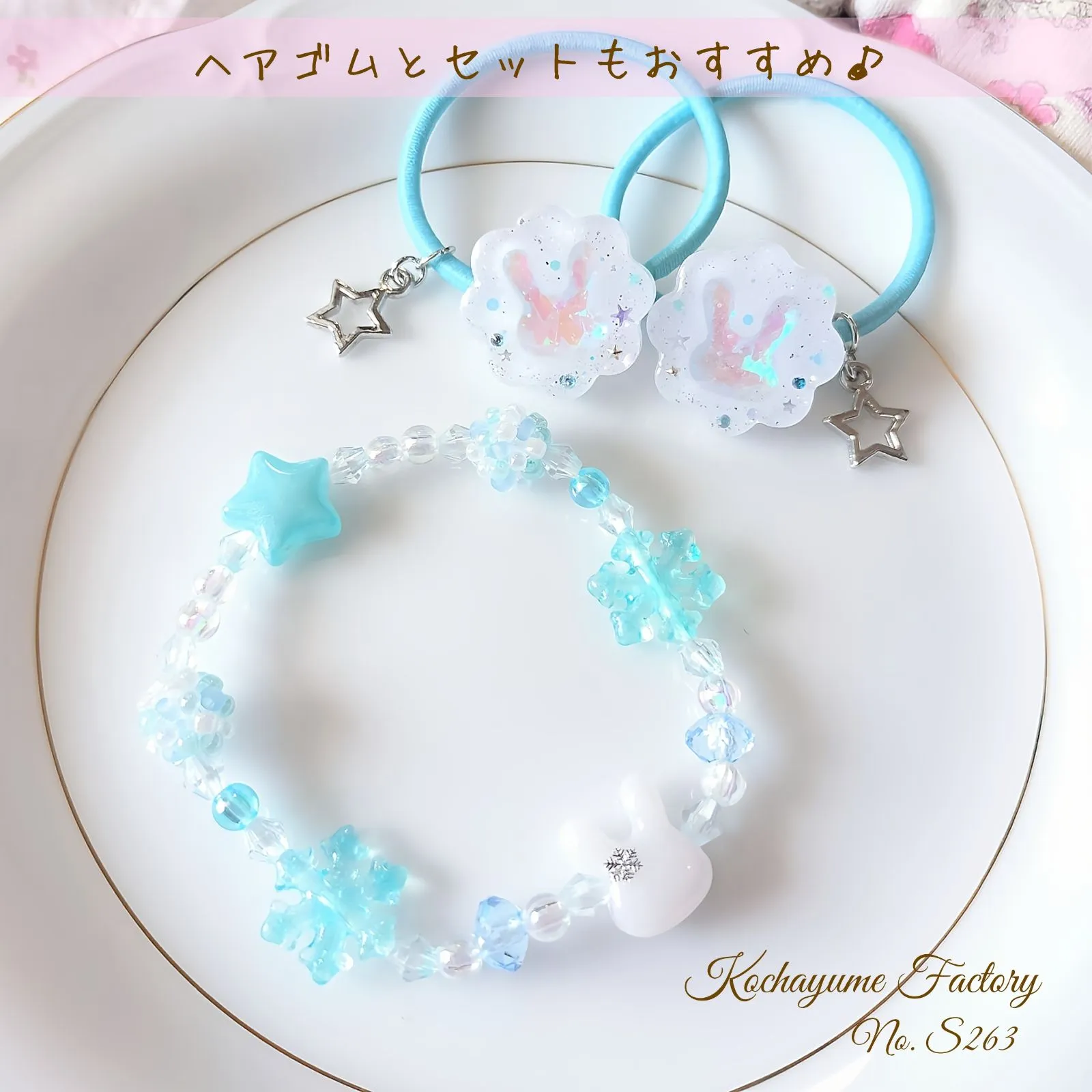 また、紹介画像にもありますが、こちらのブレスレットとお揃いのうさぎちゃんのキラキラヘアゴム(作品番号:H302)も販売しています♪