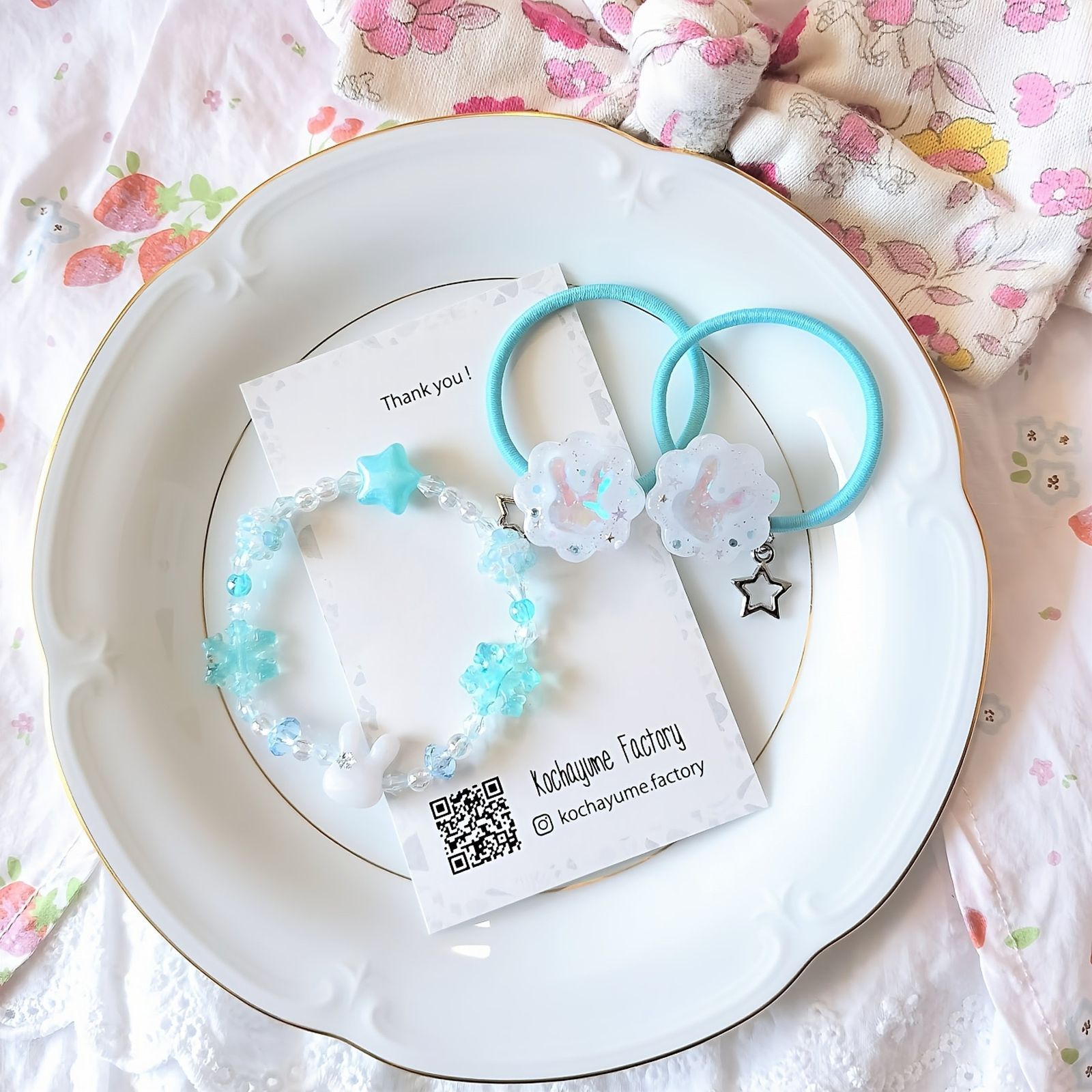 ブレスレット、ヘアゴムばら売りでも販売しています。こちらのセット販売の方がお得ですが、ばら売り希望の方は各作品ページをご覧ください(*^^*)