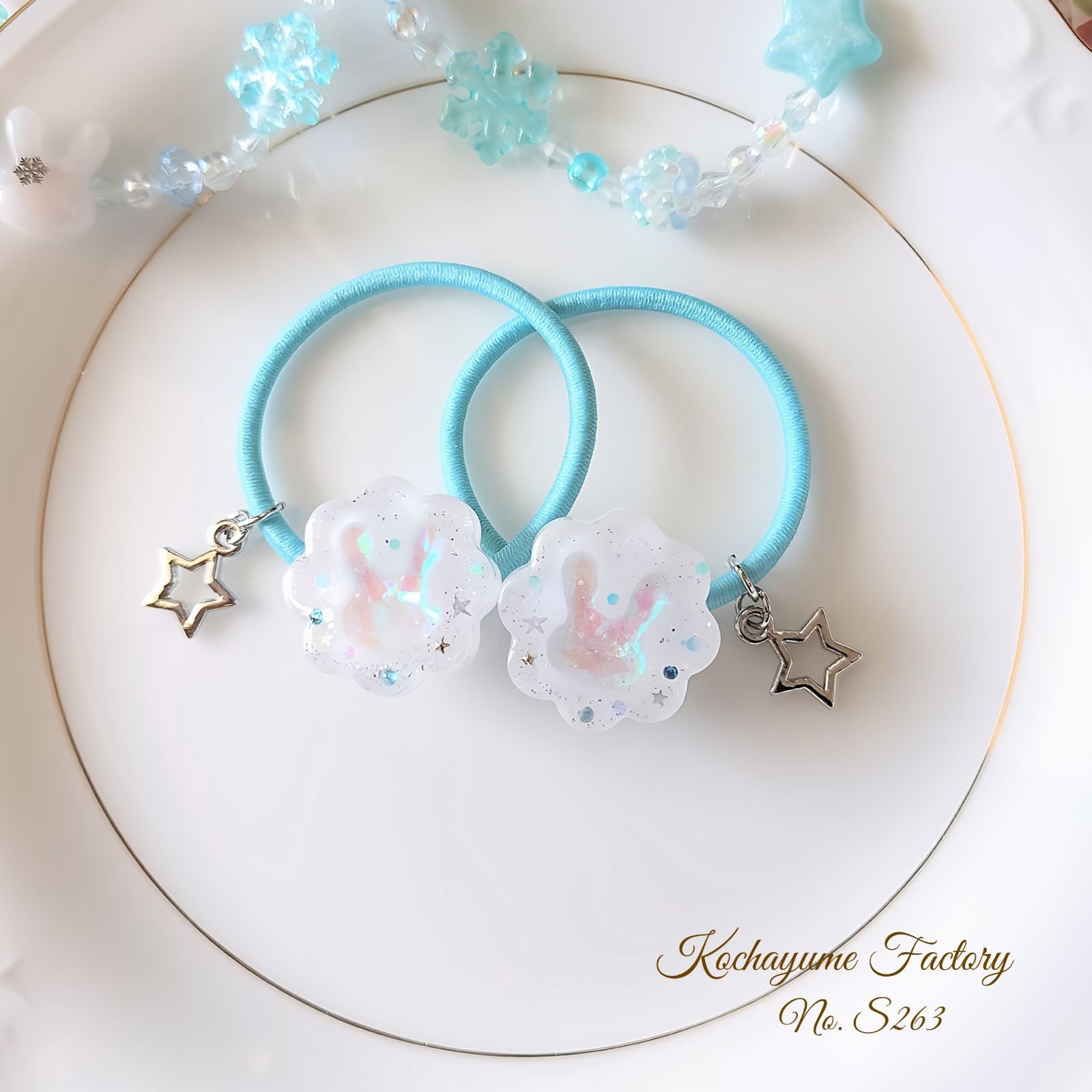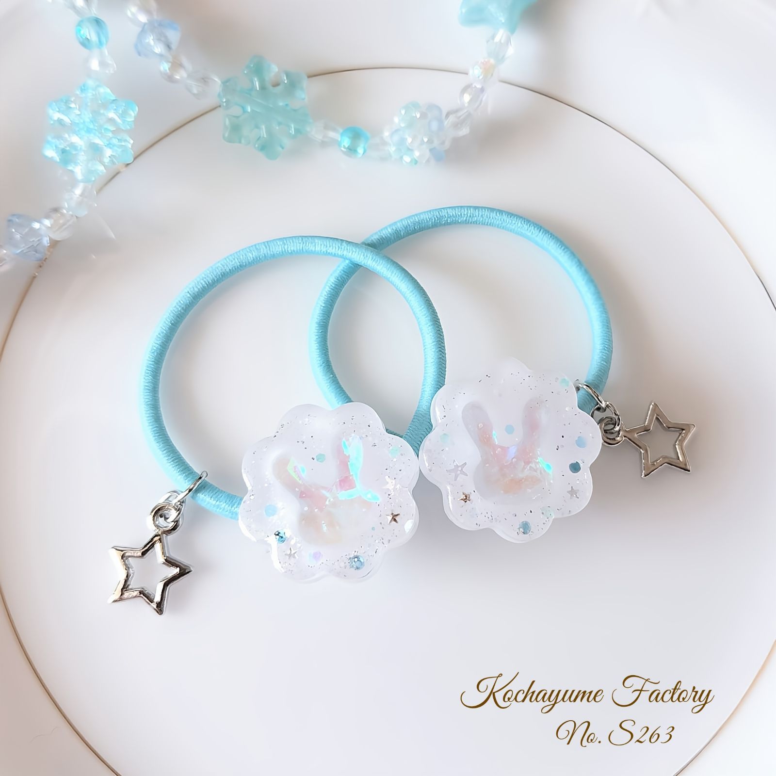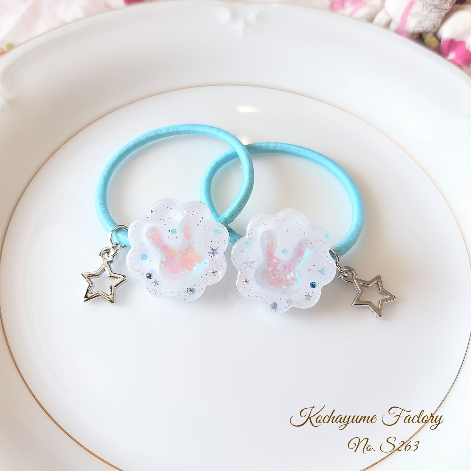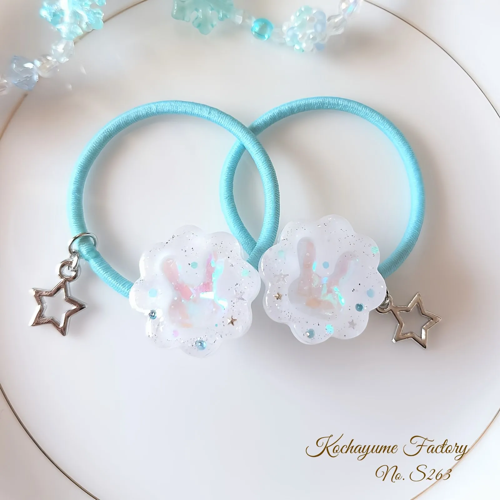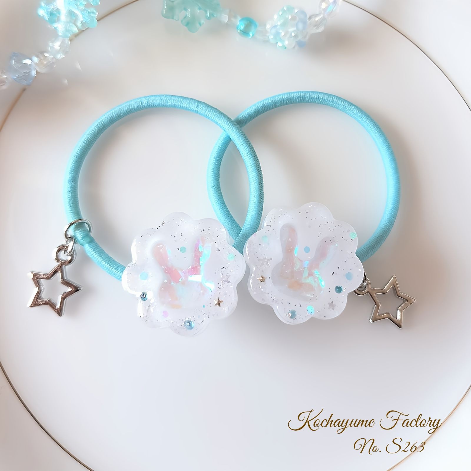 また、ブレスレットとお揃いでうさぎちゃんのキラキラヘアゴムもレジンで作りました(*^^*)