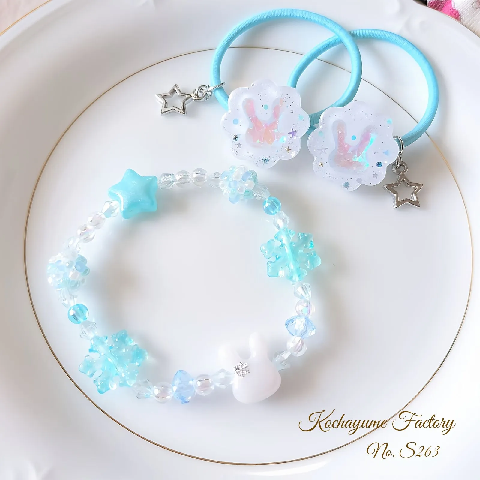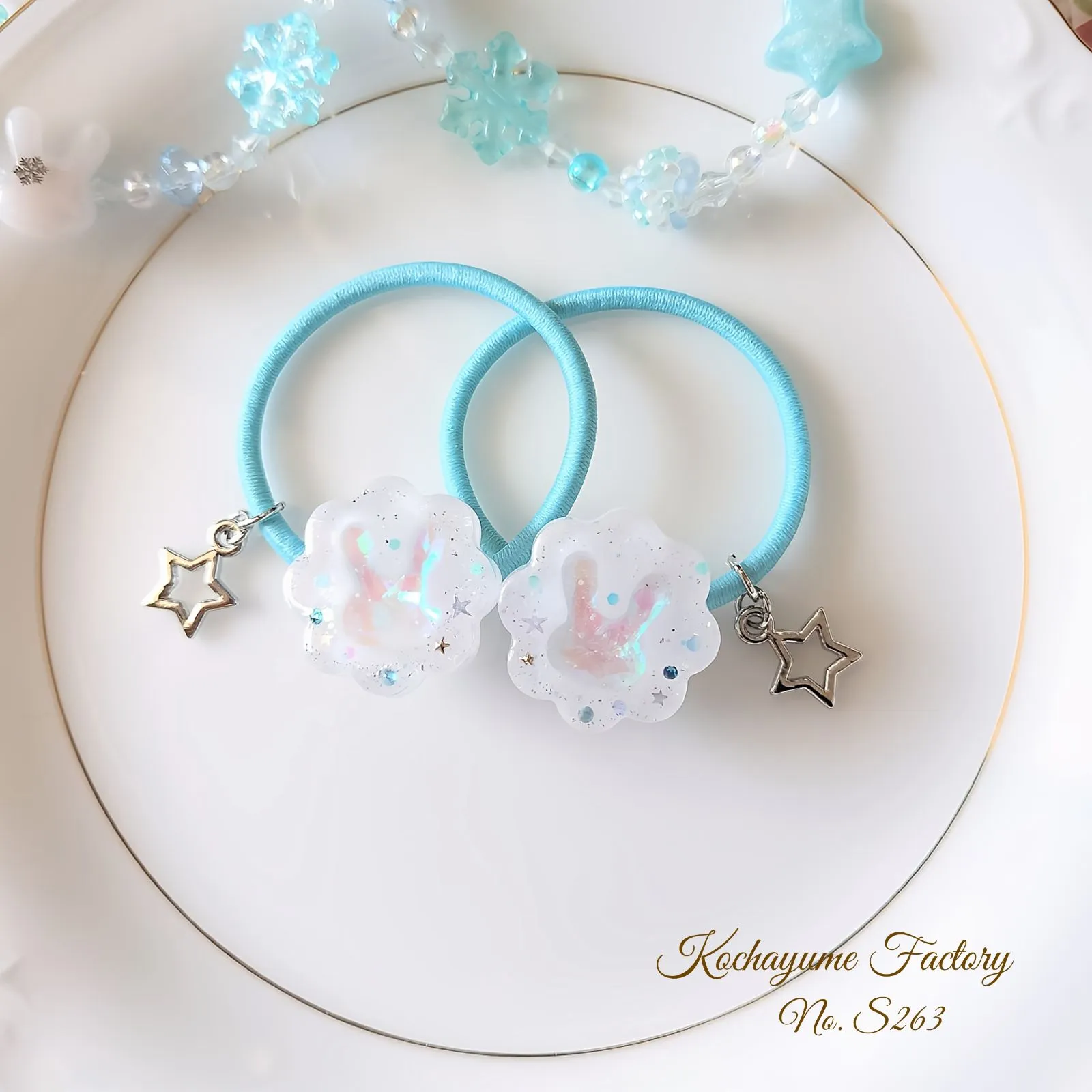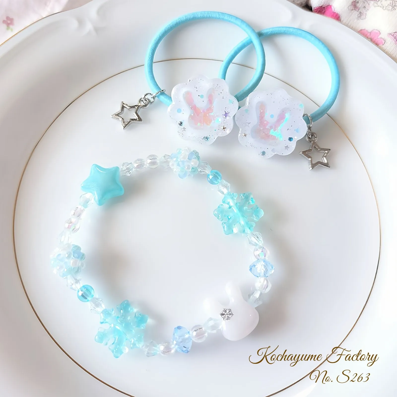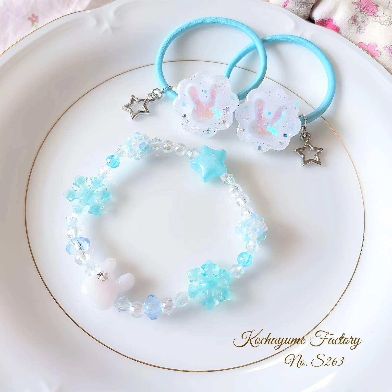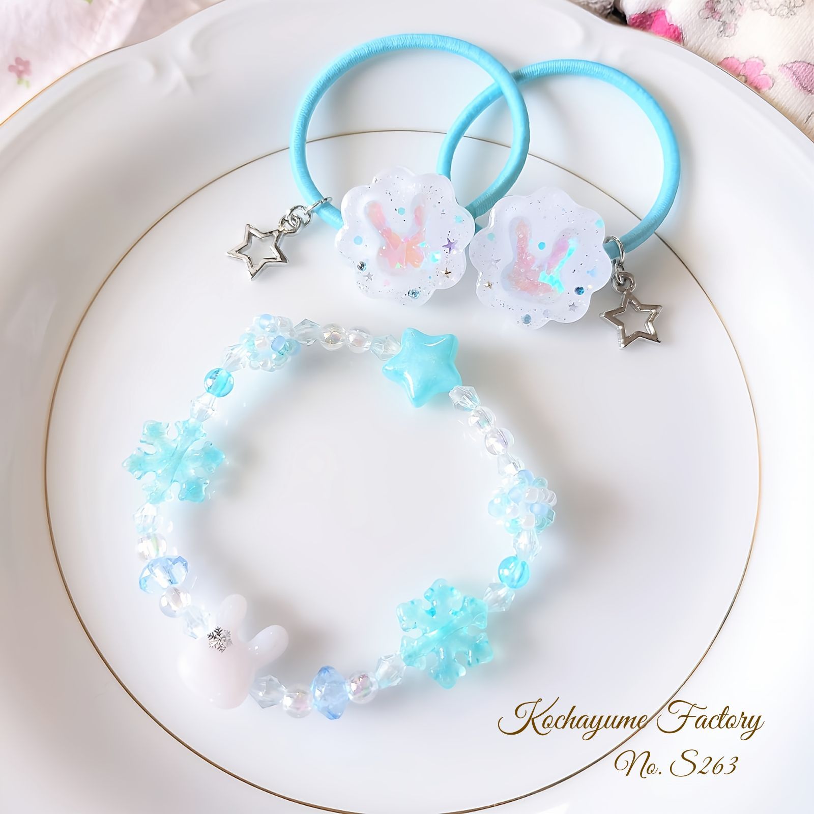また、ブレスレットとお揃いでうさぎちゃんのキラキラヘアゴムもレジンで作りました(*^^*)