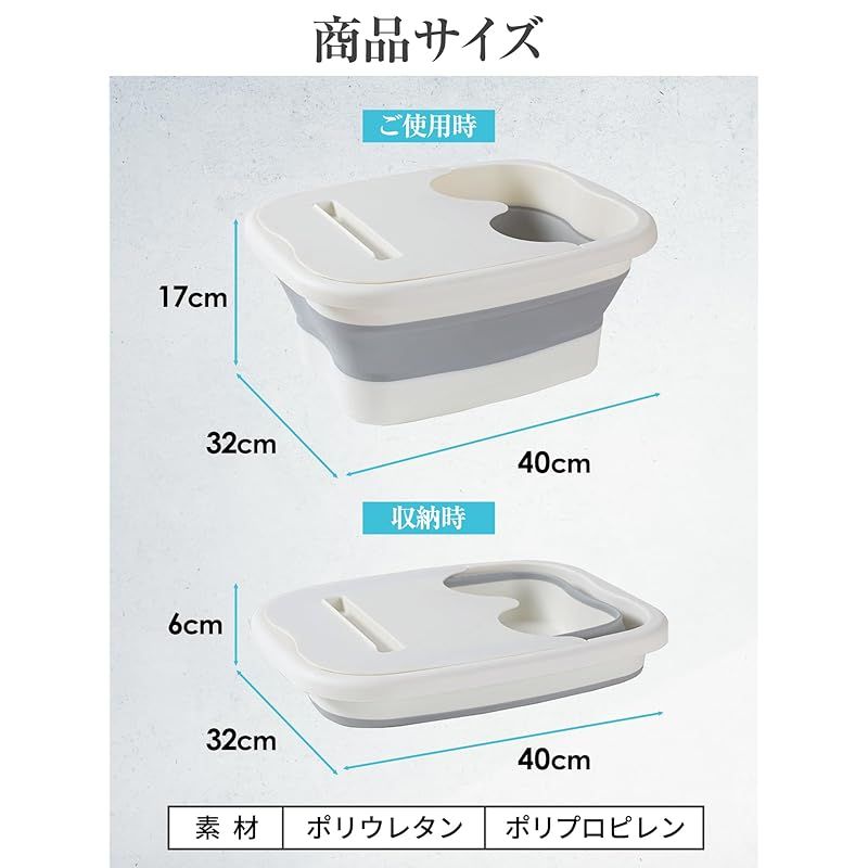 【商品詳細】足湯バケツ サイズ:幅40×32×高さ17cm(折り畳み時:高さ6cm) 材質:プラスチック カラー:ホワイト