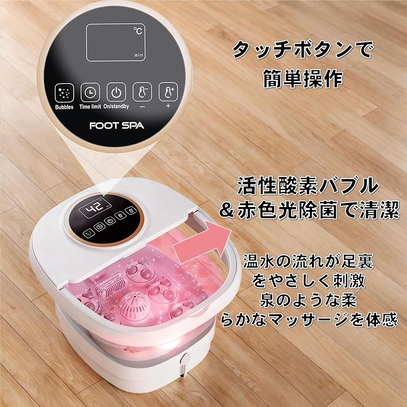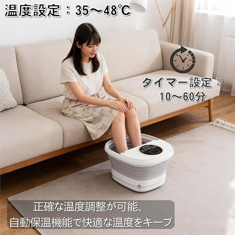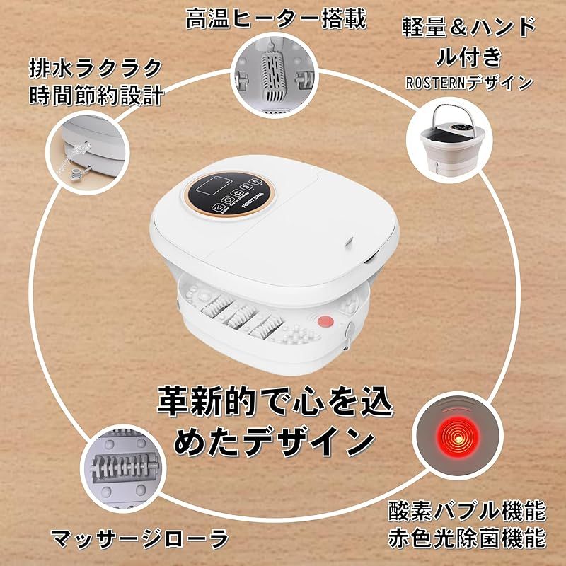 用途:足湯・フットバス・足の疲れ・むくみ・冷え対策 電源方式:電源コード式(安定加熱タイプ) 材質:高品質TPE素材(折りたたみ式でも丈夫で?持ち) ブランド:Rozeta カラー:ホワイト(シンプルで清潔感のあるデザイン) サイズ:40×35×25cm/重量:約2.2kg 特徴:折りたたみ収納・軽量設計・リモコン付き