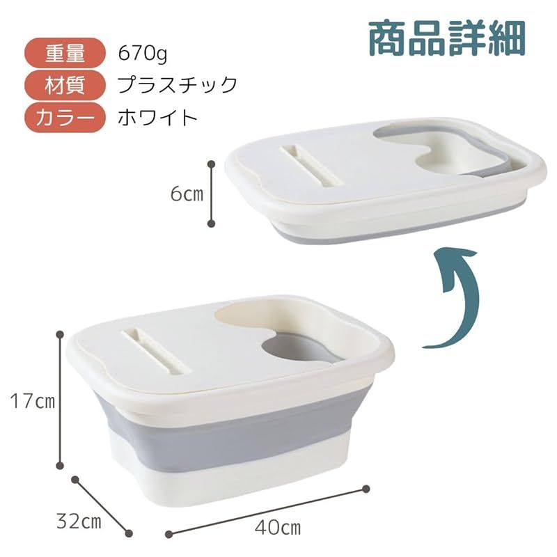 【商品詳細】サイズ(約):40×32×17cm(折り畳み時:高さ6cm) 足が入る部分(約):28cm×21cm 重量:670g 材質:プラスチック カラー:ホワイト