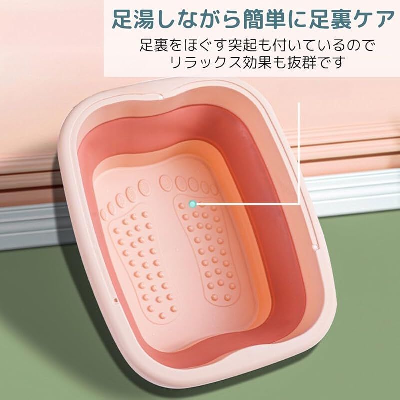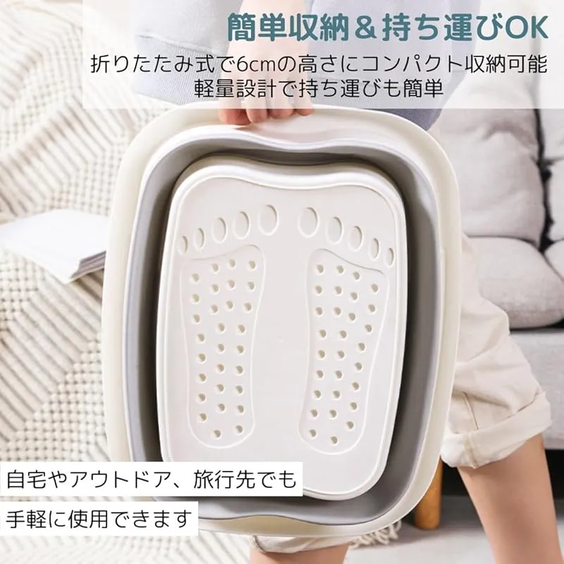 【折りたたんでコンパクト収納!持ち運びもラクラク】折りたたみ式で高さ約6cmまでコンパクトにできるフットバス。すき間に収納しやすく、使わない時も邪魔になりません。軽量設計で約670gのため、持ち運びも簡単!さらに、足裏をほぐす突起も付いているのでリラックス効果も抜群です。自宅はもちろん、アウトドアや災害時でも手軽に使用できる便利なアイテムです。