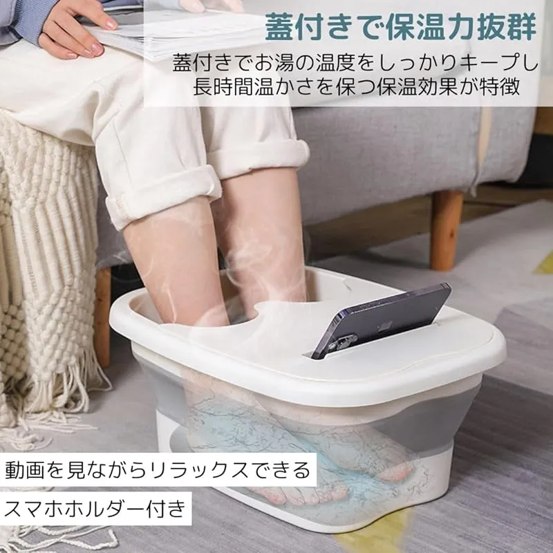 【蓋付きで保温力抜群】蓋付きでお湯の温度をしっかりキープできるフットバス。保温効果が高いので、長時間温かさを楽しめます。さらに、蓋にはスマホを差し込める穴があるため、映画や動画を見ながらリラックスタイムを満喫。電気を使わないエコな足湯で、いつでも快適に足元を癒せます。