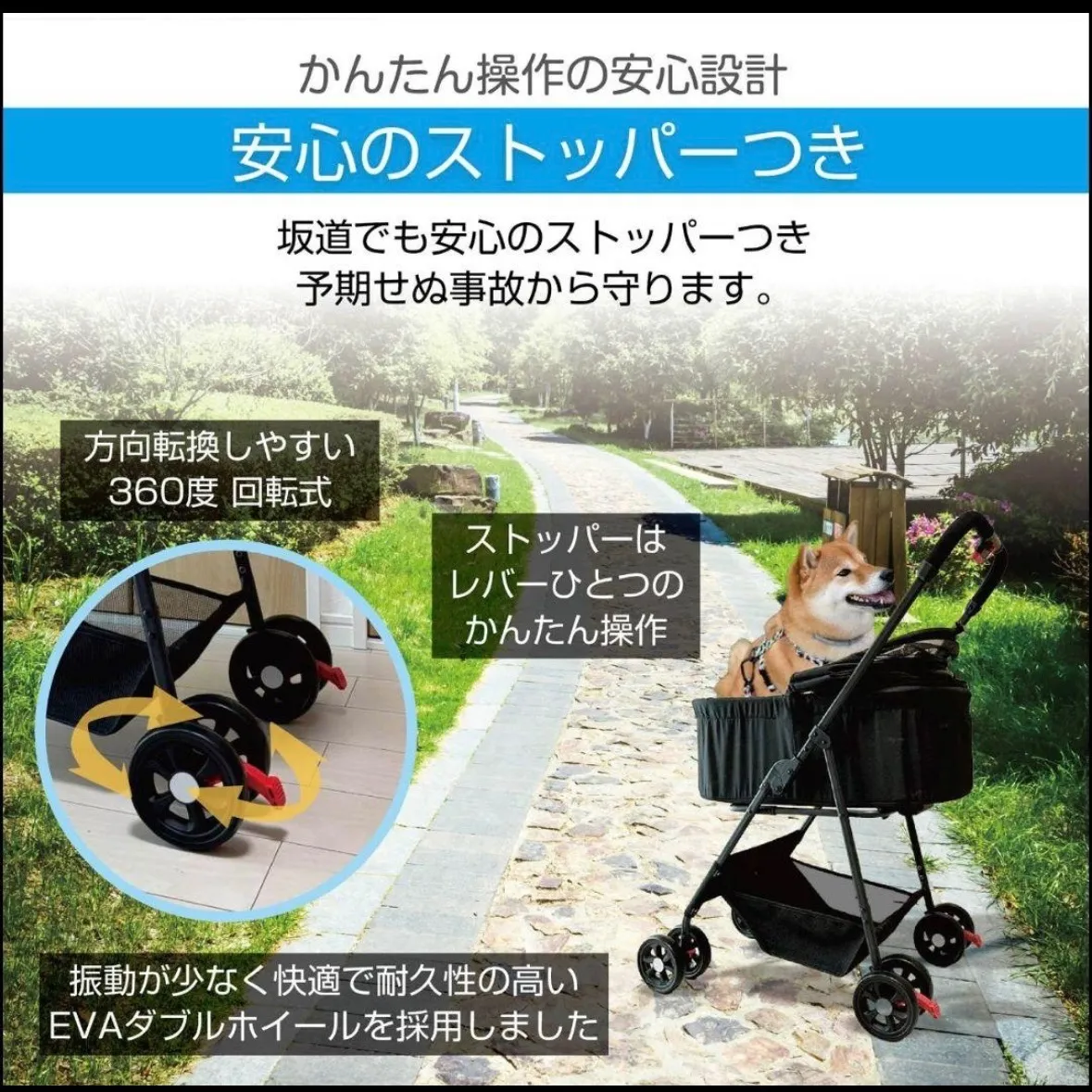 お散歩やショッピング、公園へのお出かけはもちろん、ドッグカフェや動物病院、旅行、車・電車での移動など、あらゆるシーンで活躍します。