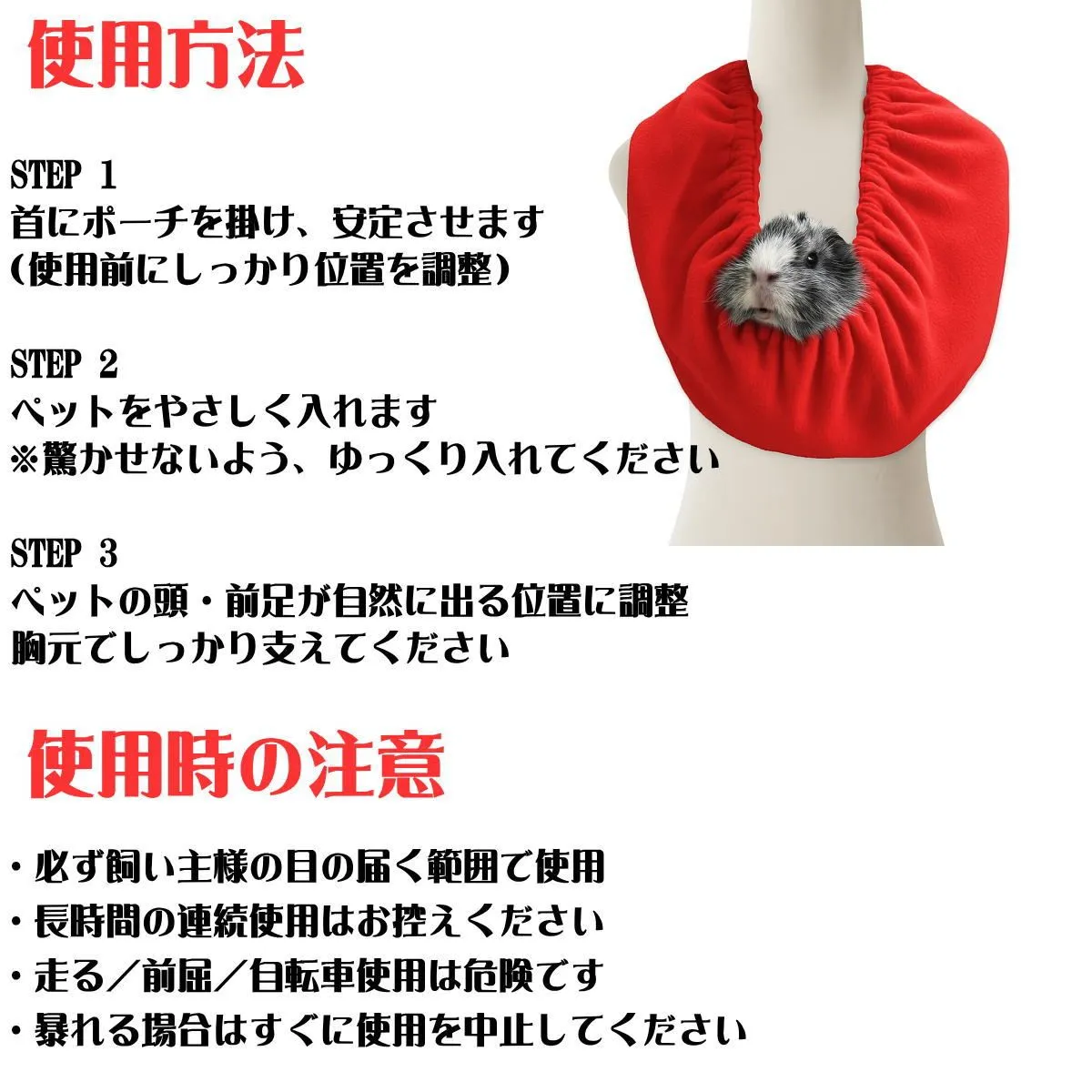 ・ペットを入れたまま前屈・走行・自転車使用はお控えください。