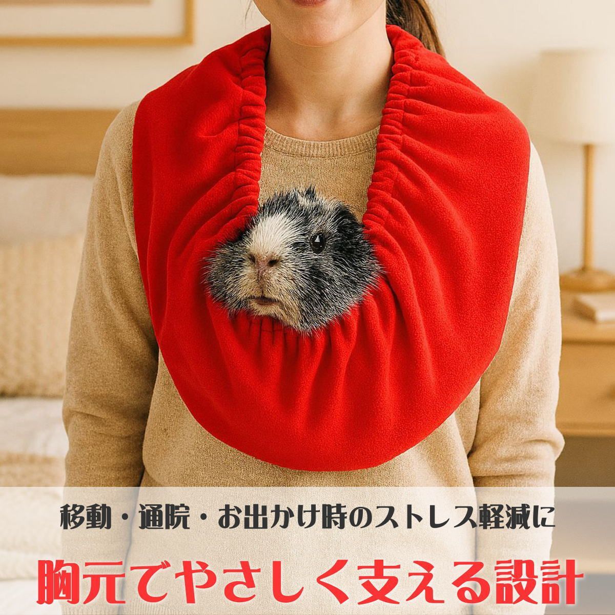ペットを胸元でやさしく支える設計で、飼い主様の体温を感じながら安心して過ごせます。