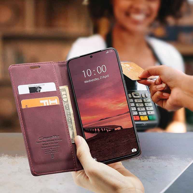「財布型カード収納」このスマホケースには、2つのカードスロットと内ポケットが付いています。カードスロットは、交通系パスやクレジットカードなど、頻繁に使用するカードの収納に最適で、内ポケットには少額の現金や名刺を収納できます。地下鉄での通勤やショッピングなど、移動をシンプルかつ効率的に行えます。ケースは強力なマグネット留め具を採用しており、開け閉めが簡単で、片手で簡単に操作できます。