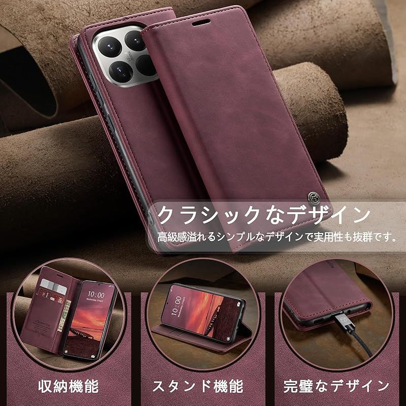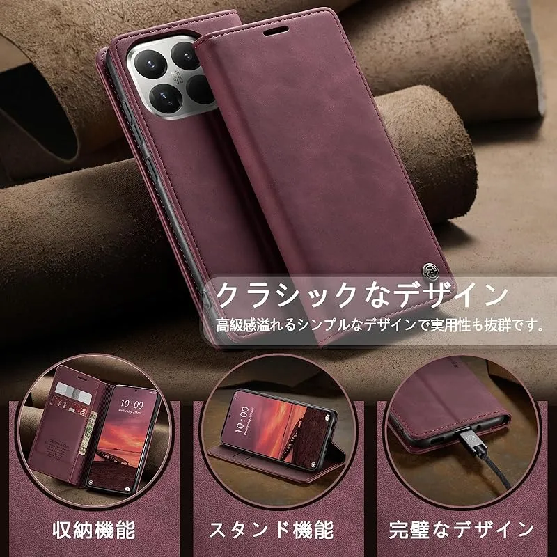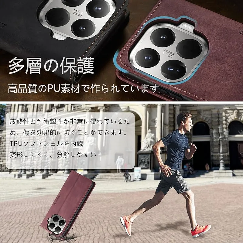 「PUレザー+TPU素材」ケースの外層は質感のあるレザーで作られており、柔らかく繊細な感触で、耐摩耗性と衝撃吸収性があり、変形しにくいです。色止め加工により、長期間使用しても色褪せしにくくなっています。ケースの側面と裏地はTPU素材で作られており、死角なく全方位から保護します。取り付け・取り外しも簡単で、携帯電話を傷つける心配もありません。