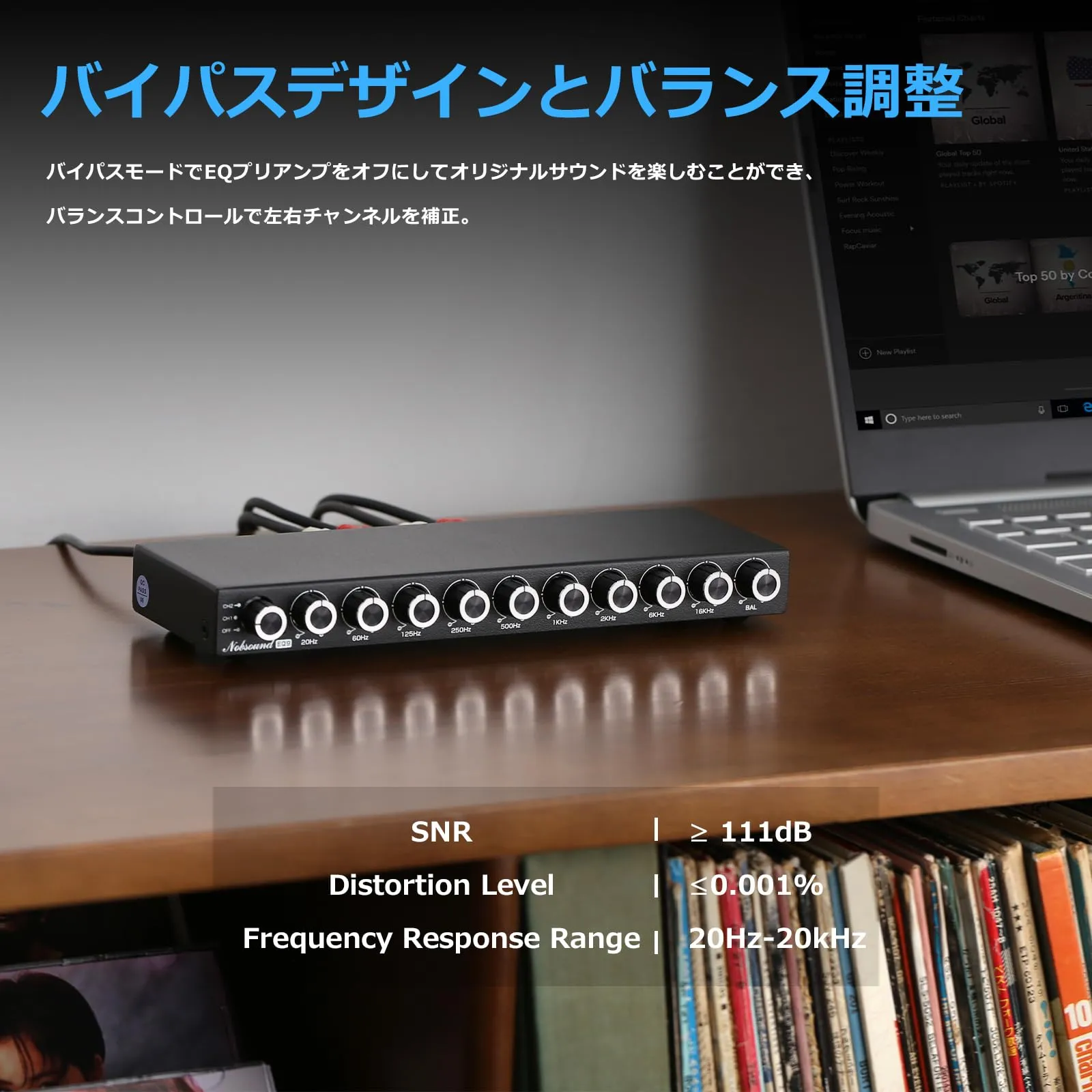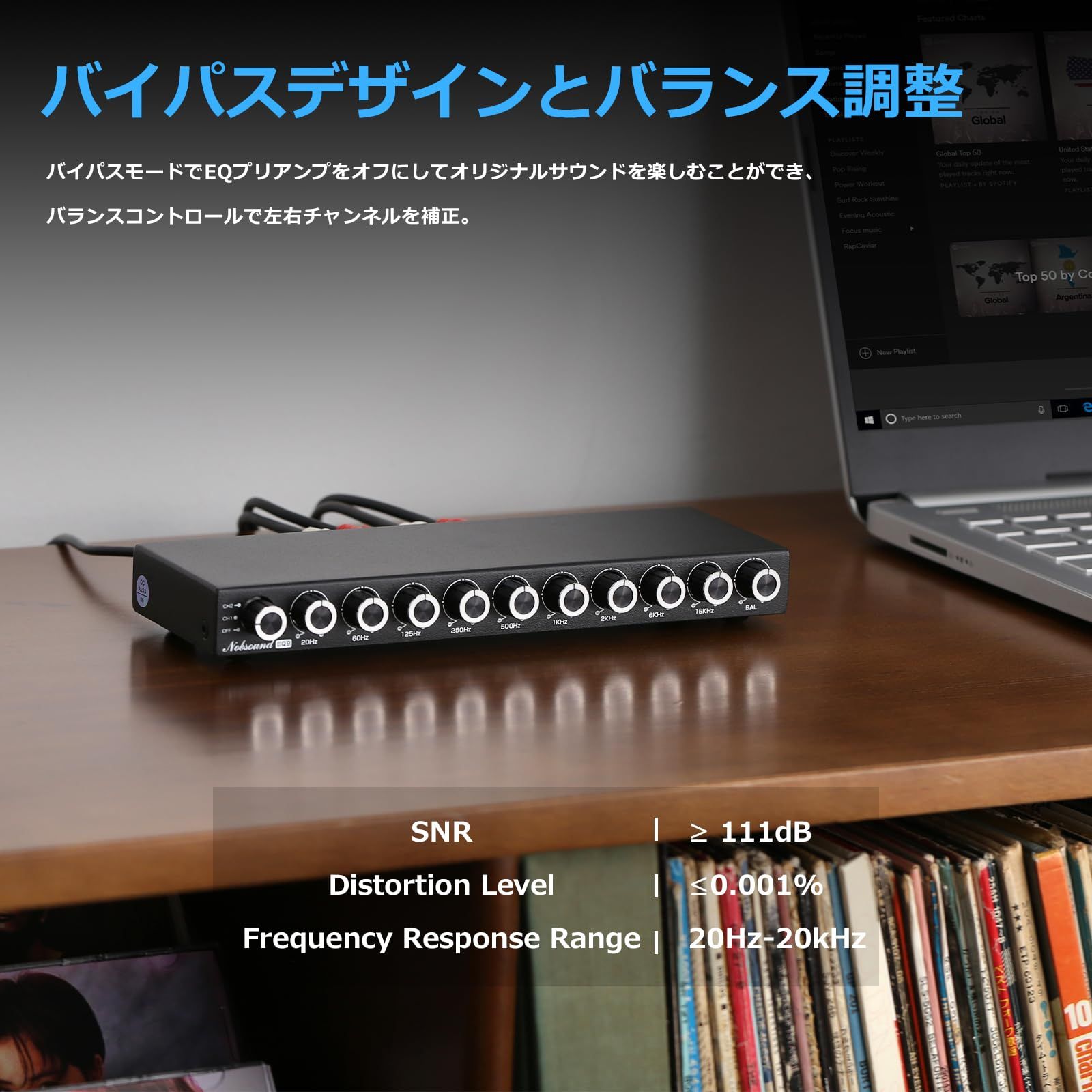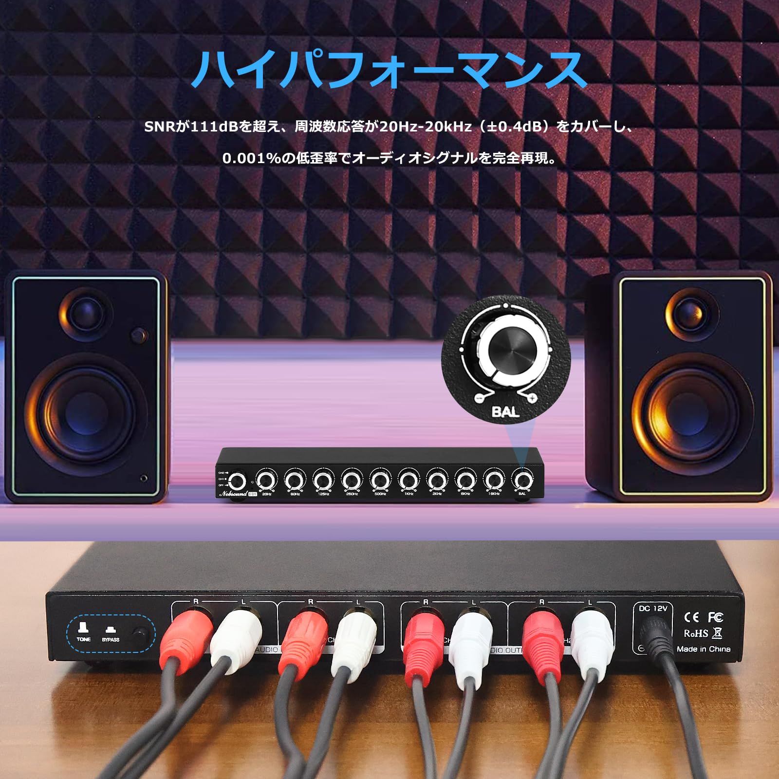 バイパスデザインとバランス調整: バイパスモードでEQプリアンプをオフにしてオリジナルサウンドを楽しむことができ、バランスコントロールで左右チャンネルを補正。
