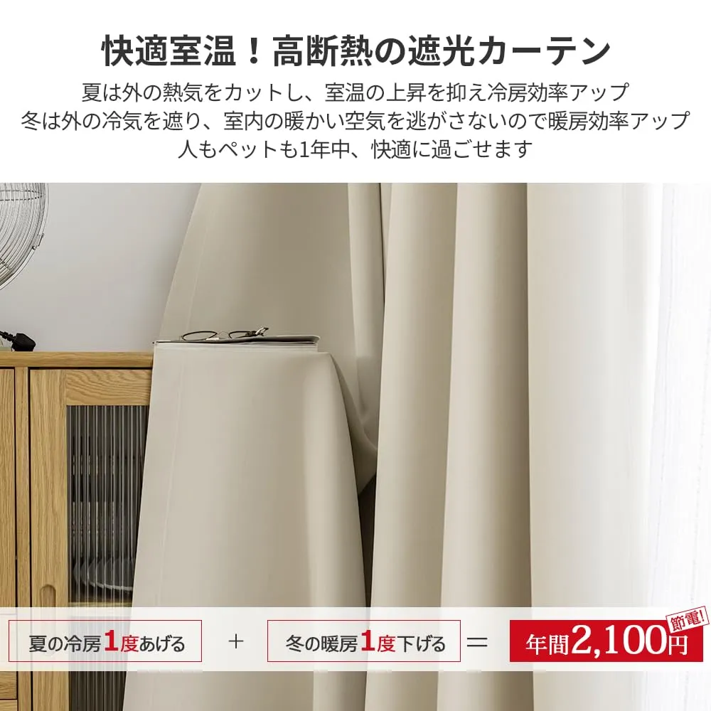 【遮熱保温・形状記憶】届いてすぐ使えるドレープカーテン2枚、同色タッセル付きます。夏は外の熱気をカットし、室温の上昇を抑え冷房効率アップします。冬は外の冷気を遮り、室内の暖かい空気を逃がさないので暖房効率もアップします。ペットにも1年中快適に過ごせます。洗濯機でまるごと洗えます。お手入れしやすいのでいつも清潔に使用できます。カーテンの重みで洗濯ジワも伸ばすことができので、形態安定としてはとても効果が期待できます。