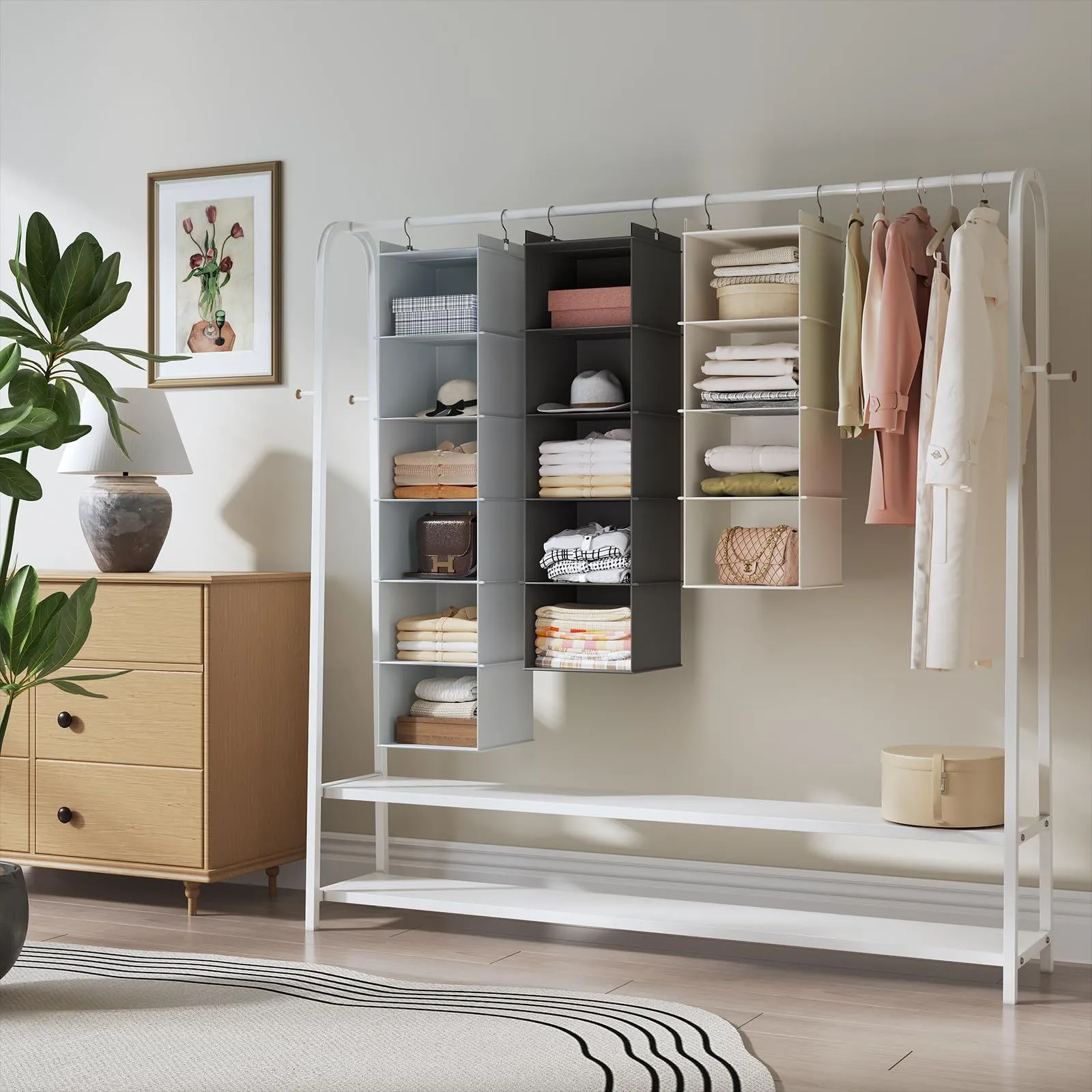【吊り下げタイプなので】クローゼットに吊るして、小物やワイシャツ、カバンや帽子などをスッキリしまえます。お洋服選びと同じように小物やカバンを選ぶことができます。