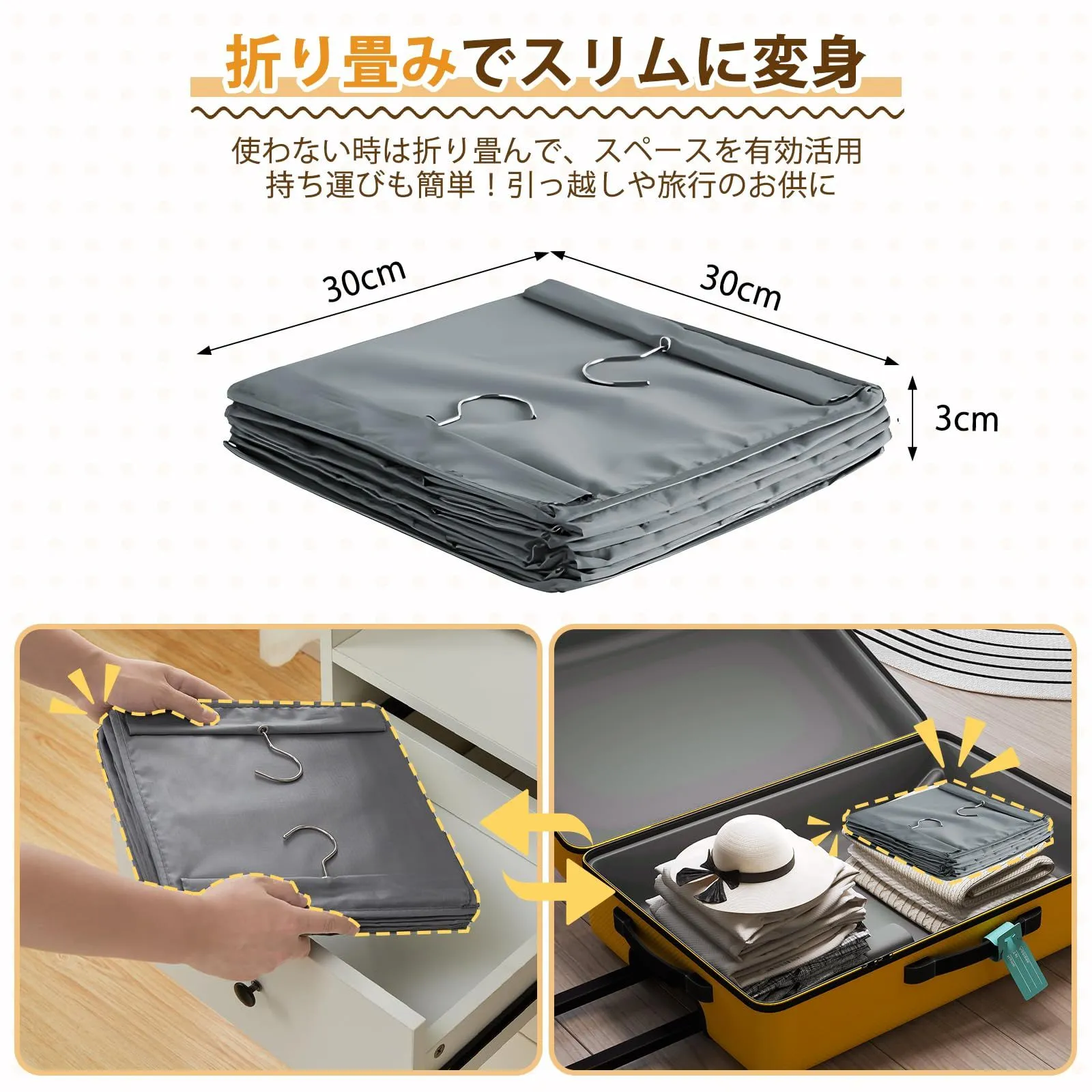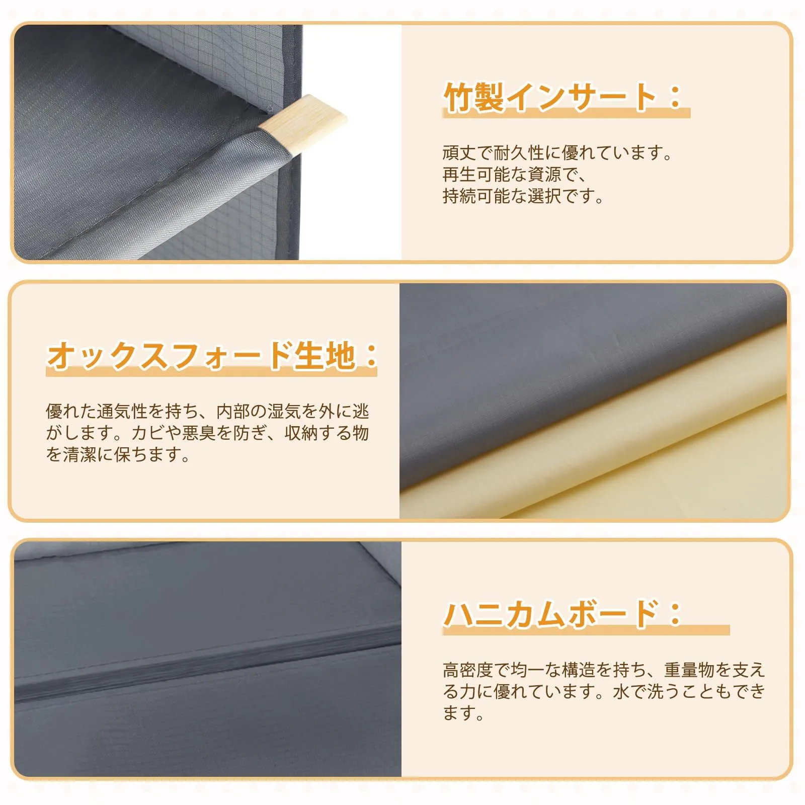 【収納に適用】厚手のしっかりしたポリエステルの生地を採用して、長時間の使用しても大丈夫。ハニカムボードの芯材入りなので、防湿性に優れ、耐力も強い!衣類や雑貨の収納など、様々な用途で大活躍します。