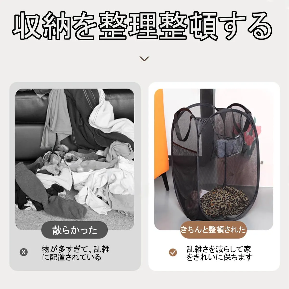 【使いやすい】組み立て不要。広げるだけで使えます。折りたたみ部分のワイヤーは伸縮性がありますので、ランドリーバスケットはゆっくりと広げてください。