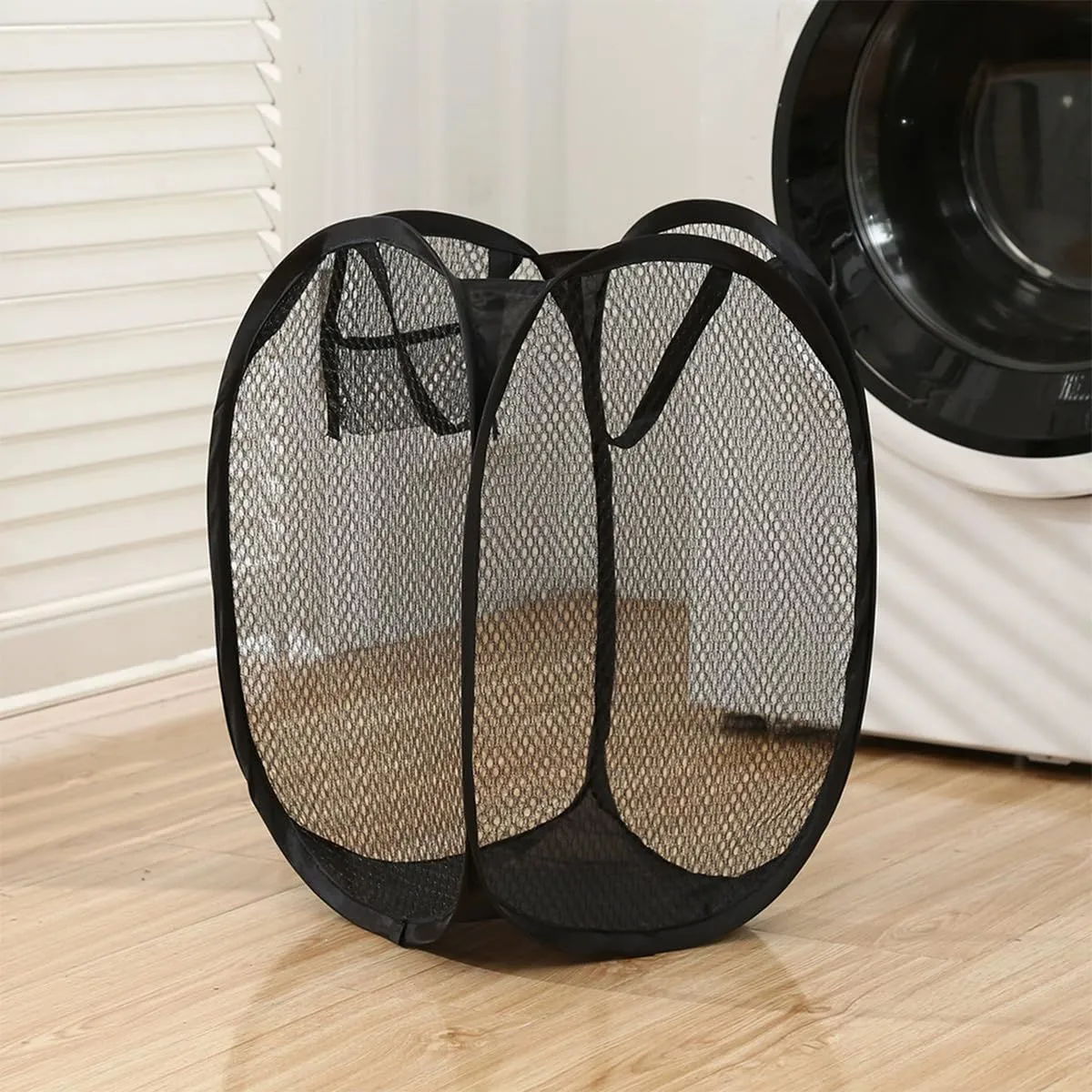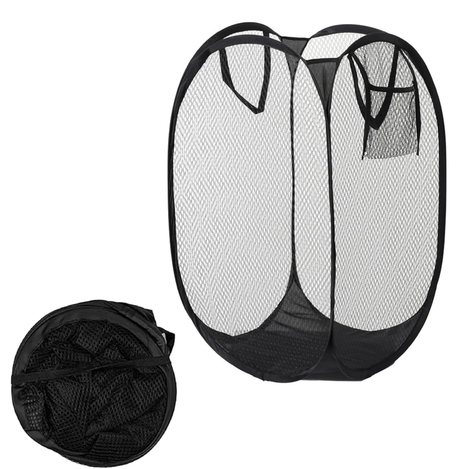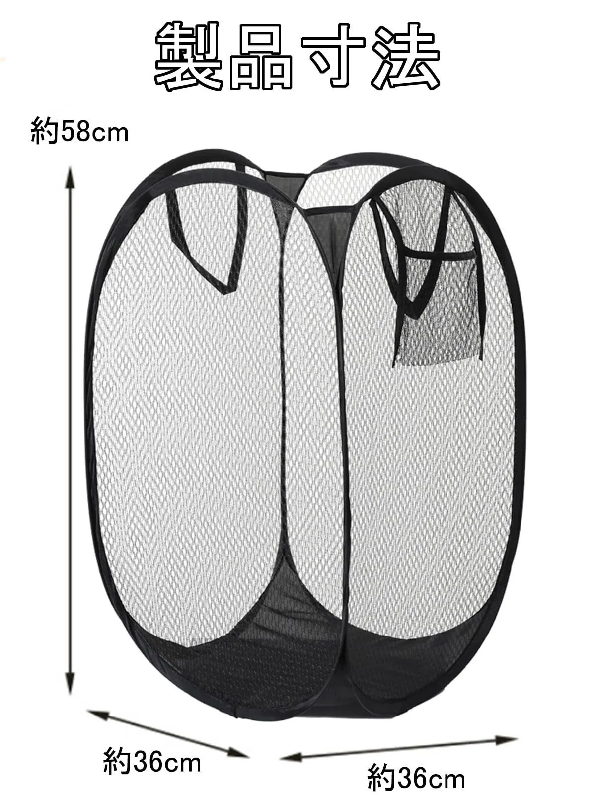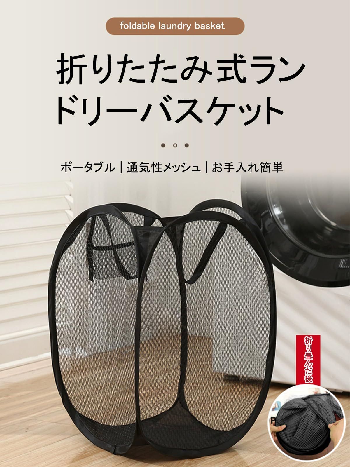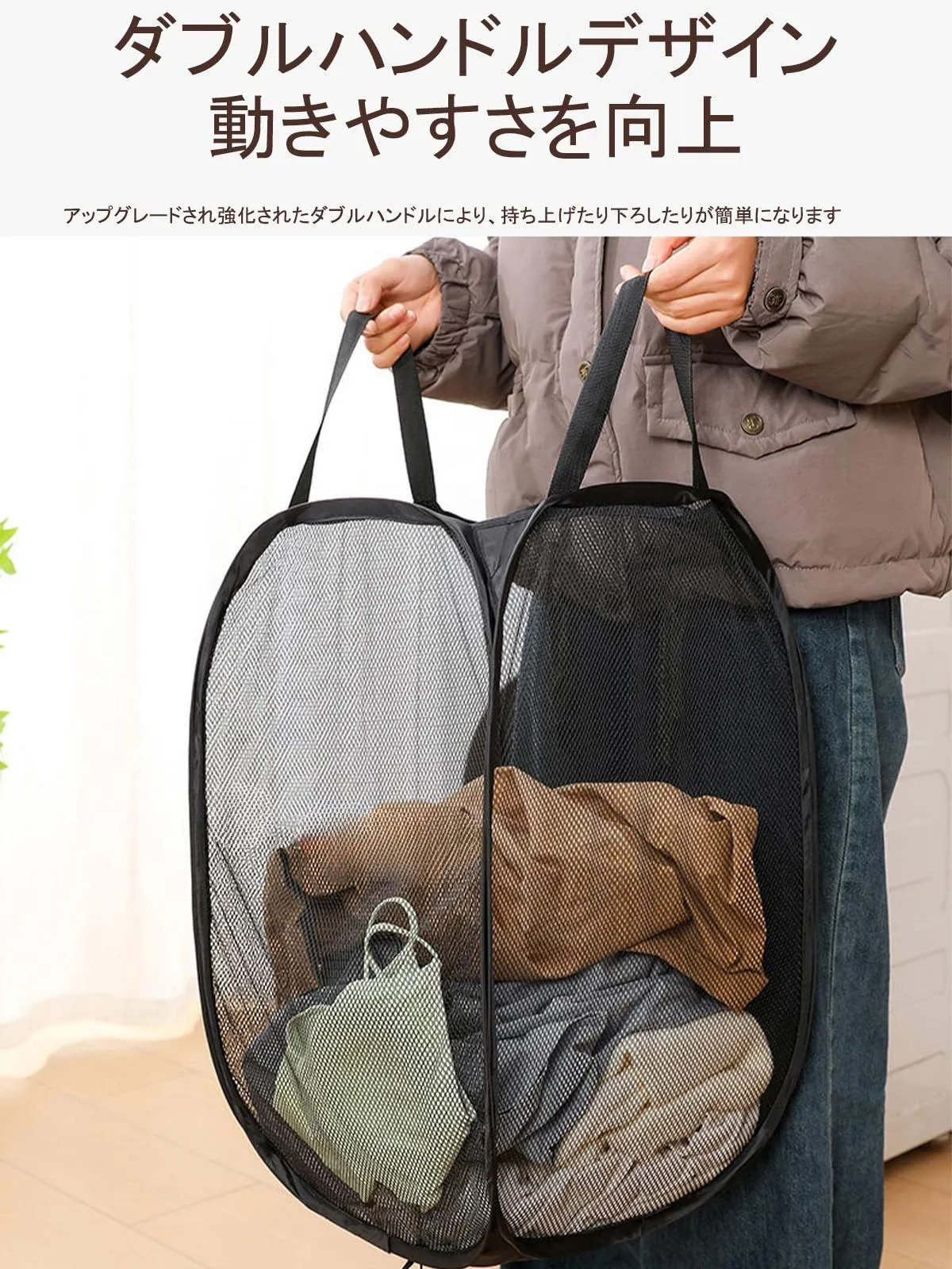 折りたたみ式ランドリーバスケット スペースを節約 メッシュランドリーバスケット 収納バスケット 持ち運びやすく軽量 ハンドル付き ブラック 1つのパッケージ